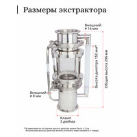 Куб нагревают до кипения, пары спирта, проходя по боковому отводу, попадают в дефлегматор, конденсируются и флегма стекает в накопительный стакан с засыпью. После того, как стакан наполнится, его содержимое уже с экстрактом выливается в перегонный куб через трубку с противоположной стороны. Этот процесс повторяется несколько раз, пока вы не достигните желаемого результата. Слив флегмы в данной модели организован по центру, что обеспечивает более эффективную работу экстрактора.