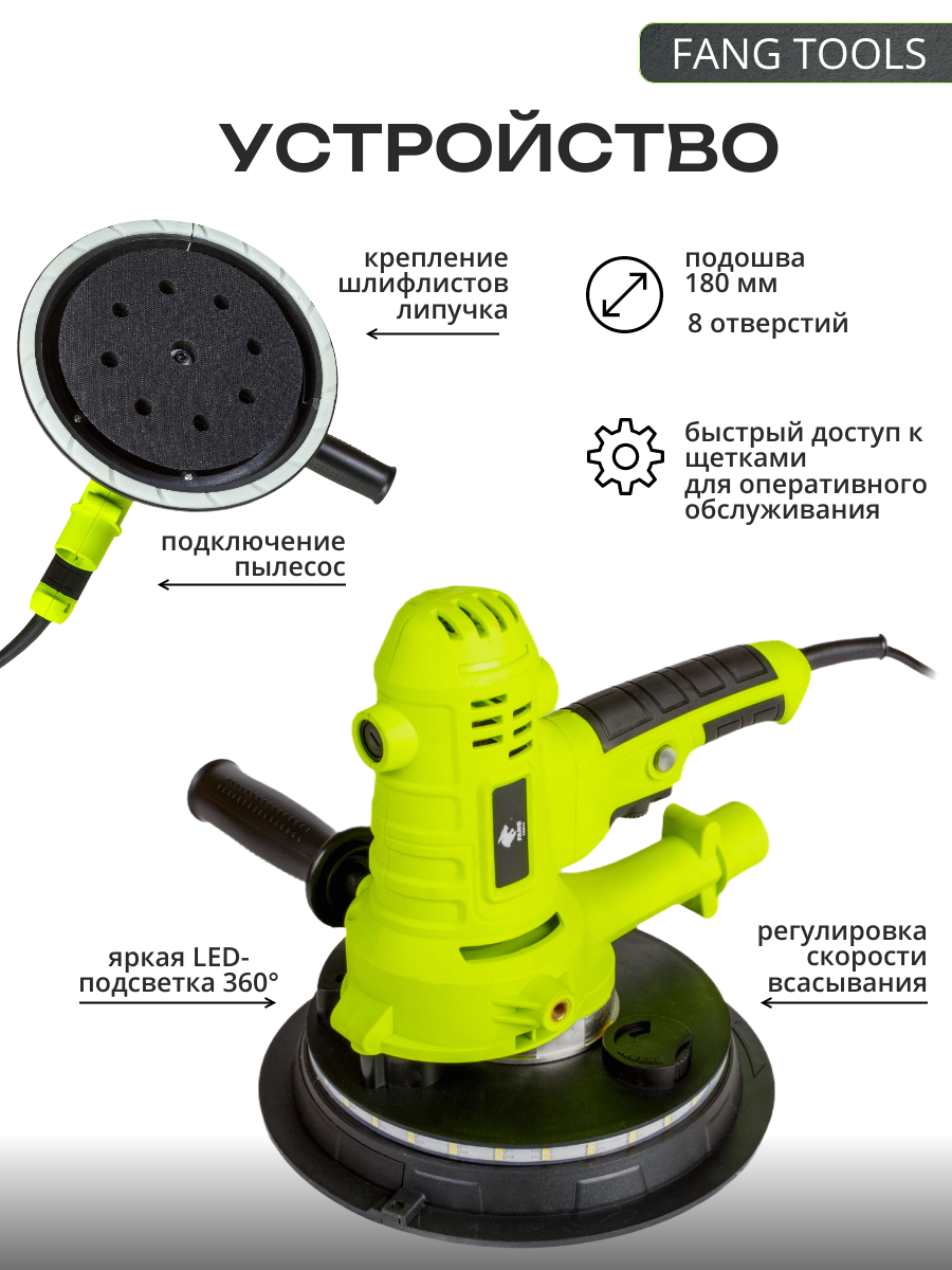 Шлифовальная машина для стен и потолка FANG TOOLS FZ1050S, Запасные щетки, Шестигранный ключ, Комплект шлифовальных кругов, Мешок для пылесоса, Шланг для подключения пылесоса.
