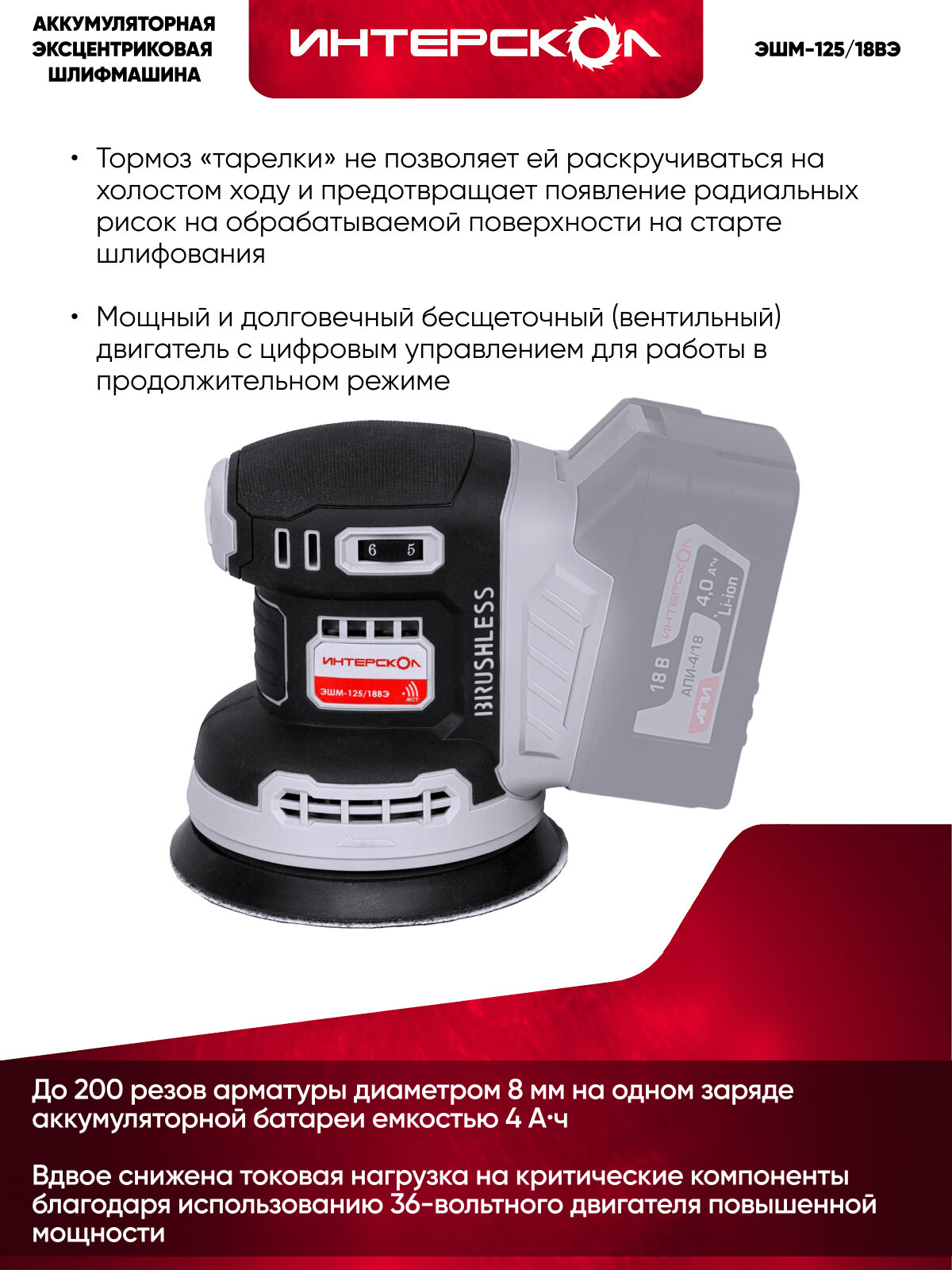 | Дополнительная информация | регулировка оборотов от 4000 об/мин до 10000 об/мин с шагом 1200 от/мин, эксцентриситет 5 мм и тормоз тарелки обеспечивает как высокую эффективность шлифовки, так и финишное качество поверхности, потому что частицы абразива каждый раз проходят по новой траектории |