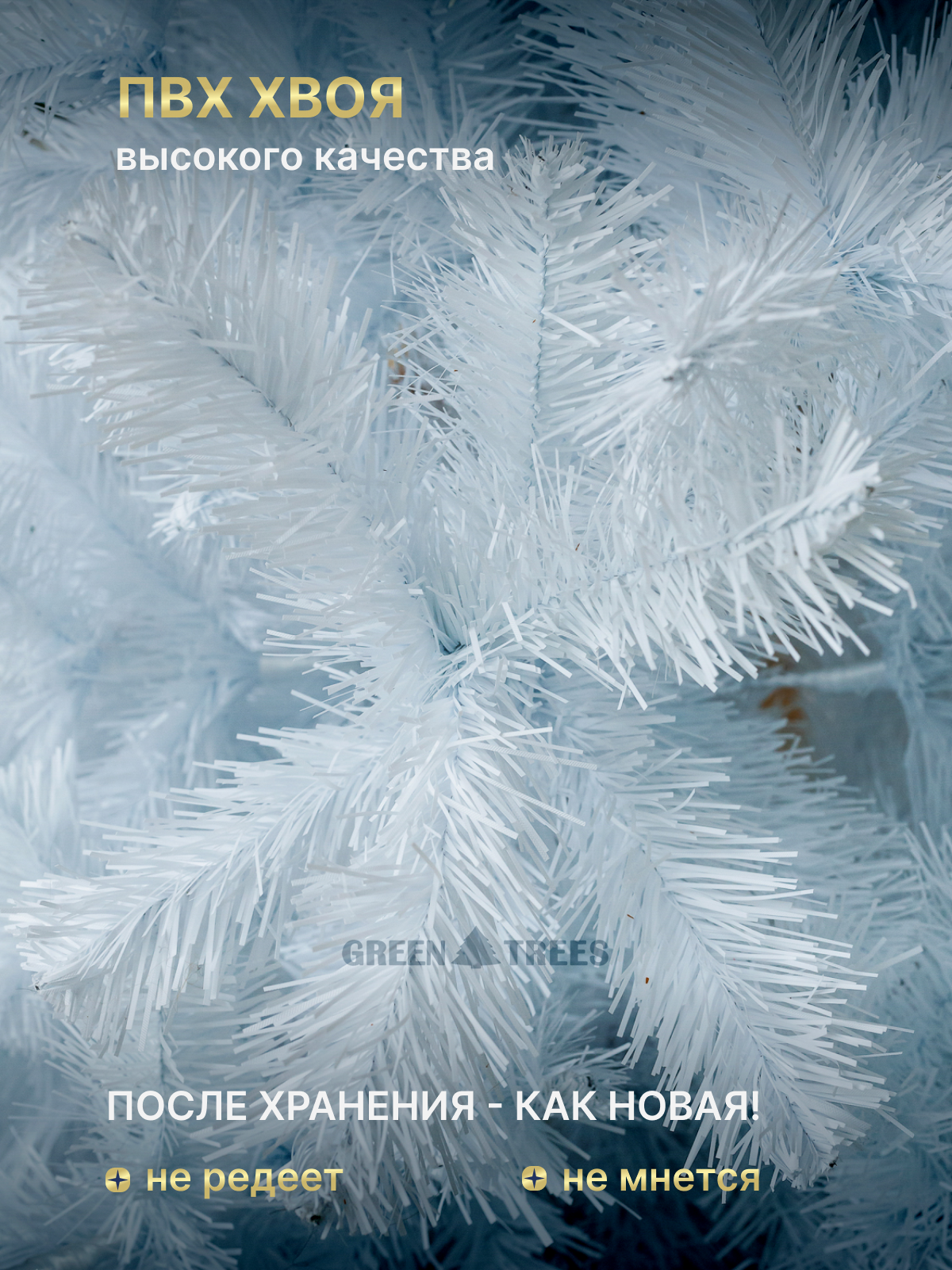 Искусственная новогодняя ель "Снежная" высотой 1,8 м (180 см) белого цвета. Ослепительно белый цвет и необыкновенная густота веток делают эту искусственную новогоднюю ёлку истинной королевой. Эта пушистая напольная ель принесет в Ваш дом волшебную атмосферу праздника в Новый год. Сборка и разборка занимает буквально считанные минуты, справится даже ребенок. Ветви елки закреплены на стволе, их просто необходимо отогнуть, аккуратно расправить и придать им естественный вид. Ветки данной ели выдержат любое количество игрушек. Хвоя елки — пленка ПВХ белого цвета, не осыпается и не имеет запаха, безопасна для детей и животных, гипоаллергенна. Материалы, используемые при изготовлении веток, обладают огнеупорными свойствами: не поддерживают горение и не выделяют дым. Ель Снежная белого цвета высотой 1.8 м производства ГРИНТРИЗ состоит из двух частей и металлической подставки, доступна в высотах 90 / 120/ 150 / 180 / 210 / 250 / 300 см.