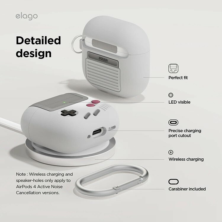 Защитный чехол для AirPods 4 от популярного корейско-американского бренда ELAGO. Выполнен в виде игровой консоли в ретро-стиле из силикона с покрытием soft-touch. Надевается на кейс, плотно облегая футляр беспроводных наушников. С помощью карабина легко крепится на одежде или ручной клади. Защищает от царапин и потёртостей. Благодаря запатентованной технологии на корпусе аксессуара предусмотрено утончение материала до 0.3 мм, которое идеально садится на LED-индикатор зарядного кейса, полноценно пропускает свет, но при этом нет отверстия, куда могут попадать частицы пыли, мусора, капель влаги. Крышка не соединена с основным корпусом чехла и крепится на устройство за счет нескользящего покрытия на внутренней поверхности, достаточно просто прижать ее. Чехол не препятствует беспроводной зарядке. Поставляется в оригинальной упаковке производителя.