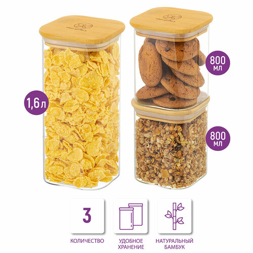 Набор 3 банок для хранения Elan Gallery Crystal glass, 2 шт по 800 мл +1,6 л, с бамбук. крышками с силик. уплотнит.: сравнение цен, характеристики, фото, актуальное наличие и цены.