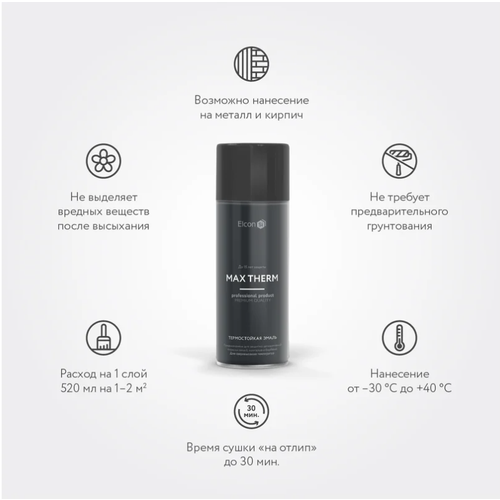 Термостойкая краска для металла, печей, мангалов, радиаторов, дымоходов, суппортов Elcon Max Therm черная 1200 градусов аэрозоль 520 мл 00-00004051 предназначена для антикоррозионнои защиты металлоконструкции, оборудования, печеи для саун, дымовых труб, выхлопных систем автомобилеи, деталеи двигателеи, емкостного оборудования, подвергающихся в процессе эксплуатации воздеиствию температур от -60 °С до +1200 °С*, а также для окраски минеральных поверхностеи, длительно эксплуатируемых в условиях умеренного климата.