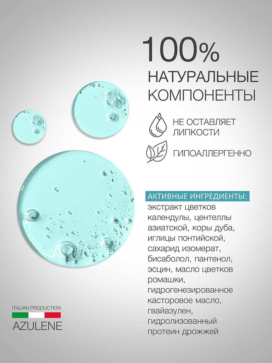 Функциональные ингредиенты: экстракт цветков календулы, экстракт центеллы азиатской, экстракт коры дуба, экстракт иглицы, пантенол, эсцин, масло цветков ромашки, ПЭГ-40 гидрогенезированное касторовое масло, гвайазулен, гидролизованные протеины дрожжей.