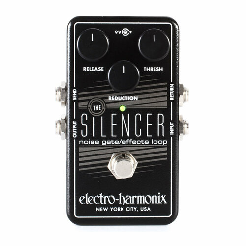 Гитарная педаль Electro-Harmonix Silencer представляет собой систему шумоподавления, деликатно укрощающая паразитные шумы, возникающие как от окружающих источников электромагнитного излучения, так и от несовершенства электронных компонентов аналоговых схем на пути аудиотракта, стараясь сохранить нетронутым музыкальную составляющую сигнала. Устройство работает как экспандер-гейт, или VCA-компрессор наоборот, подавляя до -70дБ сигналы ниже установленного регулятором Tresh порогового значения и усиливая до +4дБ сигналы превышающие порог, в соответствии с настройками степени подавления Reduction, что может зависеть от шумности звукоснимателей, усилителей, педалей и прочего оборудования. Таким образом, достигается эффект естественного шумоподавления без ухудшения качества и выразительности звука. Регулятор Release позволяет настроить характер затухания хвоста после достижения упомянутого выше порога, плавно заглушив его, сделав это быстро или медленно, вплоть до четырёх секунд, в зависимости от стиля игры, будь то зубодробильные риффы, скоростной шред, или тягучие медленные инструментальные баллады.