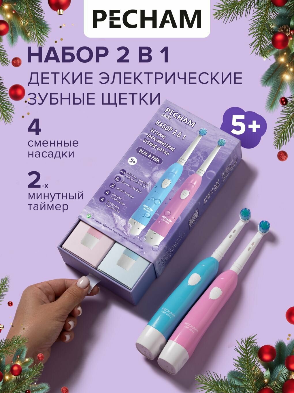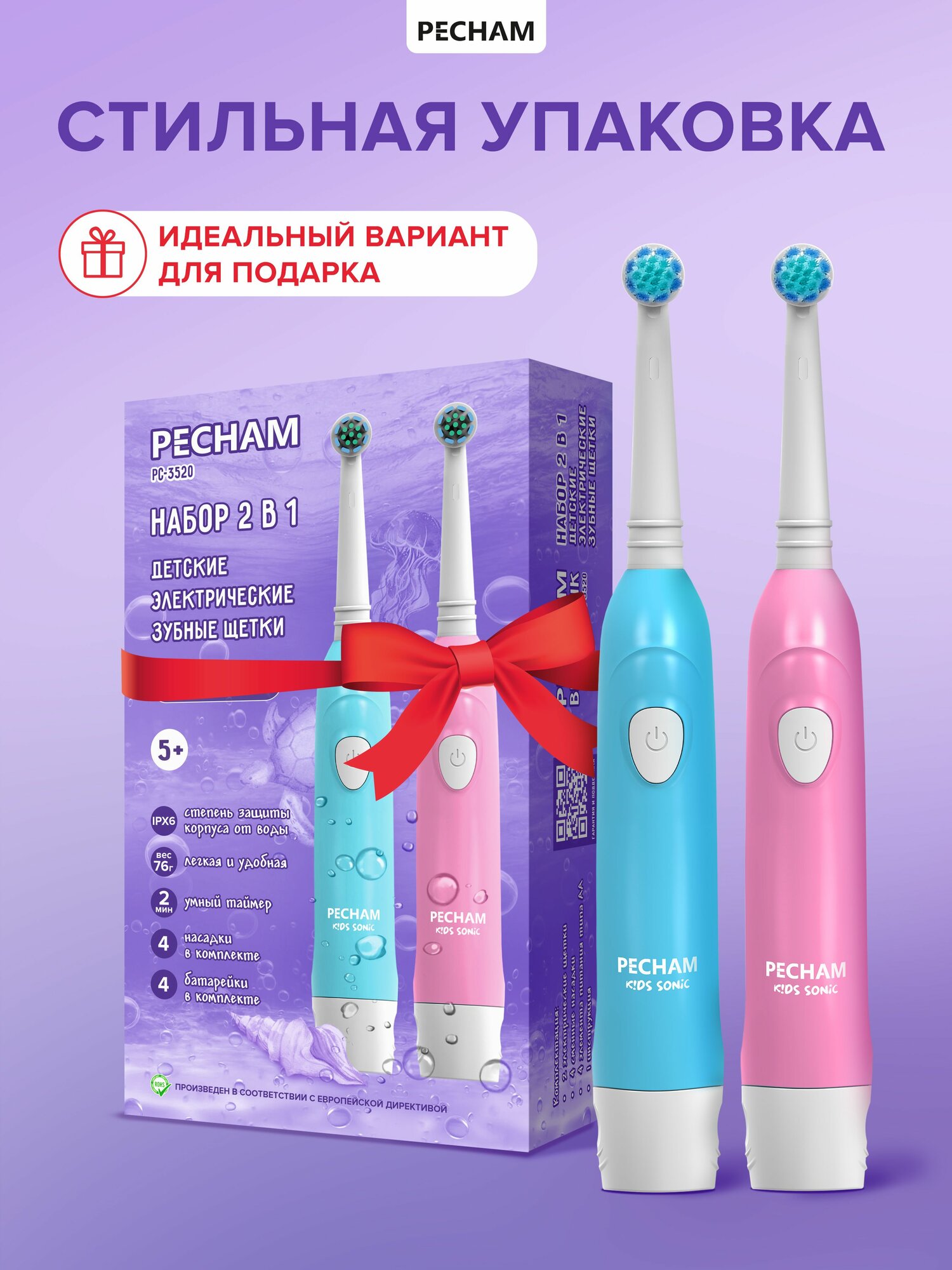 | Подробная комплектация | 2 шт электрическая зубная щетка детская, 4 шт сменные насадки, 4 шт батарейки AA, 2 шт цветная коробка, 2 шт инструкция на русском языке с гарантийным талоном. |
