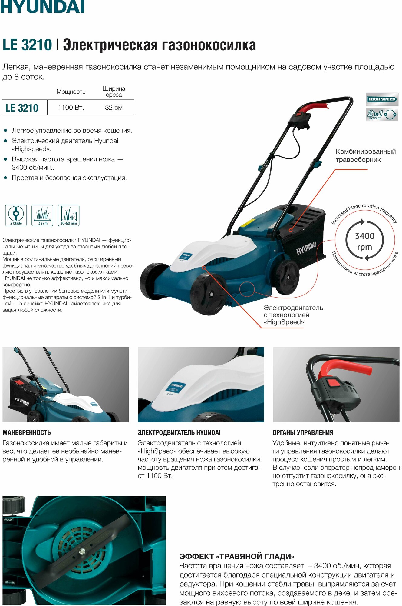 Купить Электрическая газонокосилка Hyundai LE 3210, 1100 Вт, 32 см с доставкой по всей России.