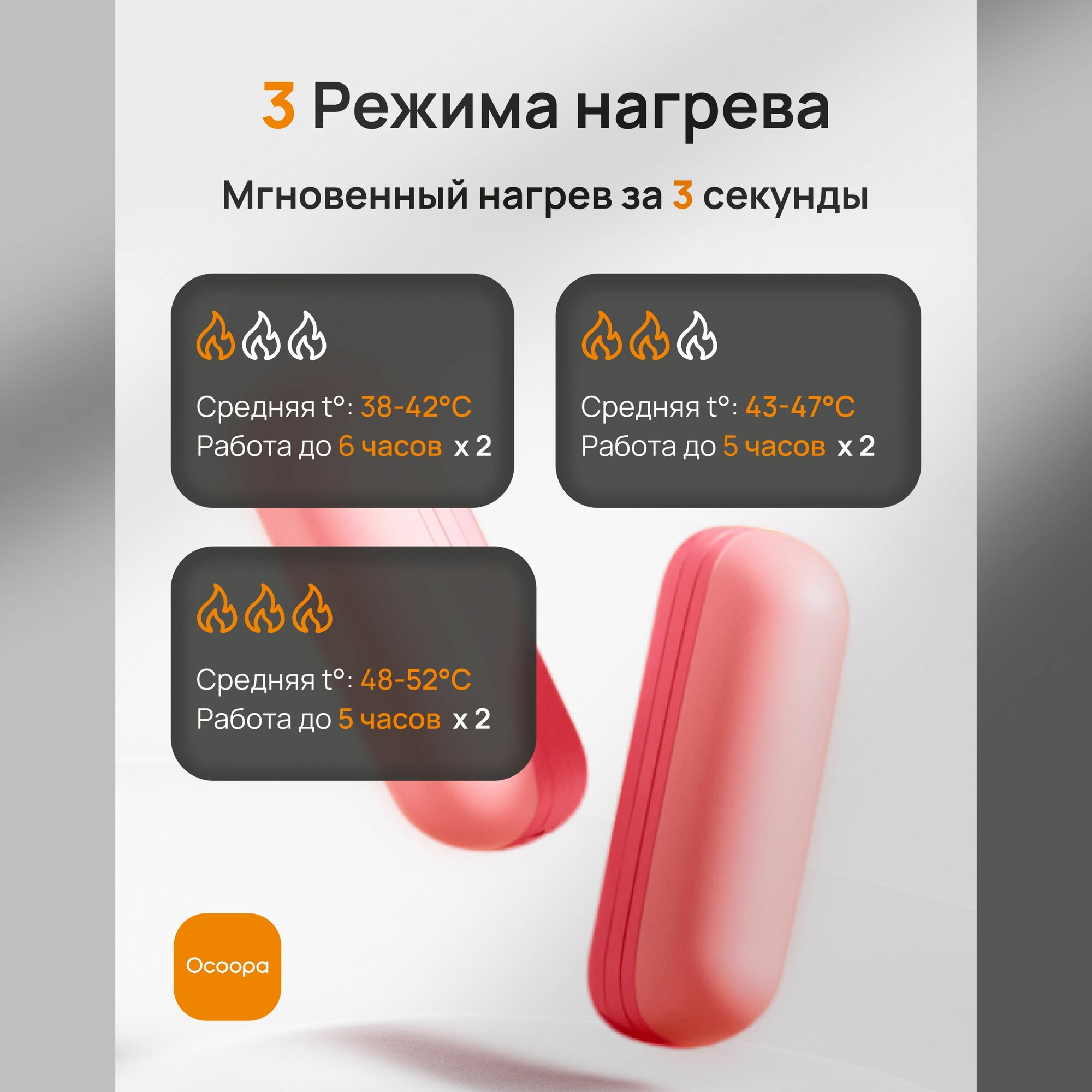 ● Мгновенный нагрев за 3 секунды. Наслаждайтесь быстрым, всего за 3 секунды, и безопасным нагревом от 38°C до 52℃. Грелки изготовлены из высококачественных материалов, с превосходной производительностью аккумулятора и гарантией 1 год. Они обеспечивают безопасное, надежное тепло и идеально подходят для тех, кто работает на открытом воздухе, или для тех кто часто мерзнет даже дома.
