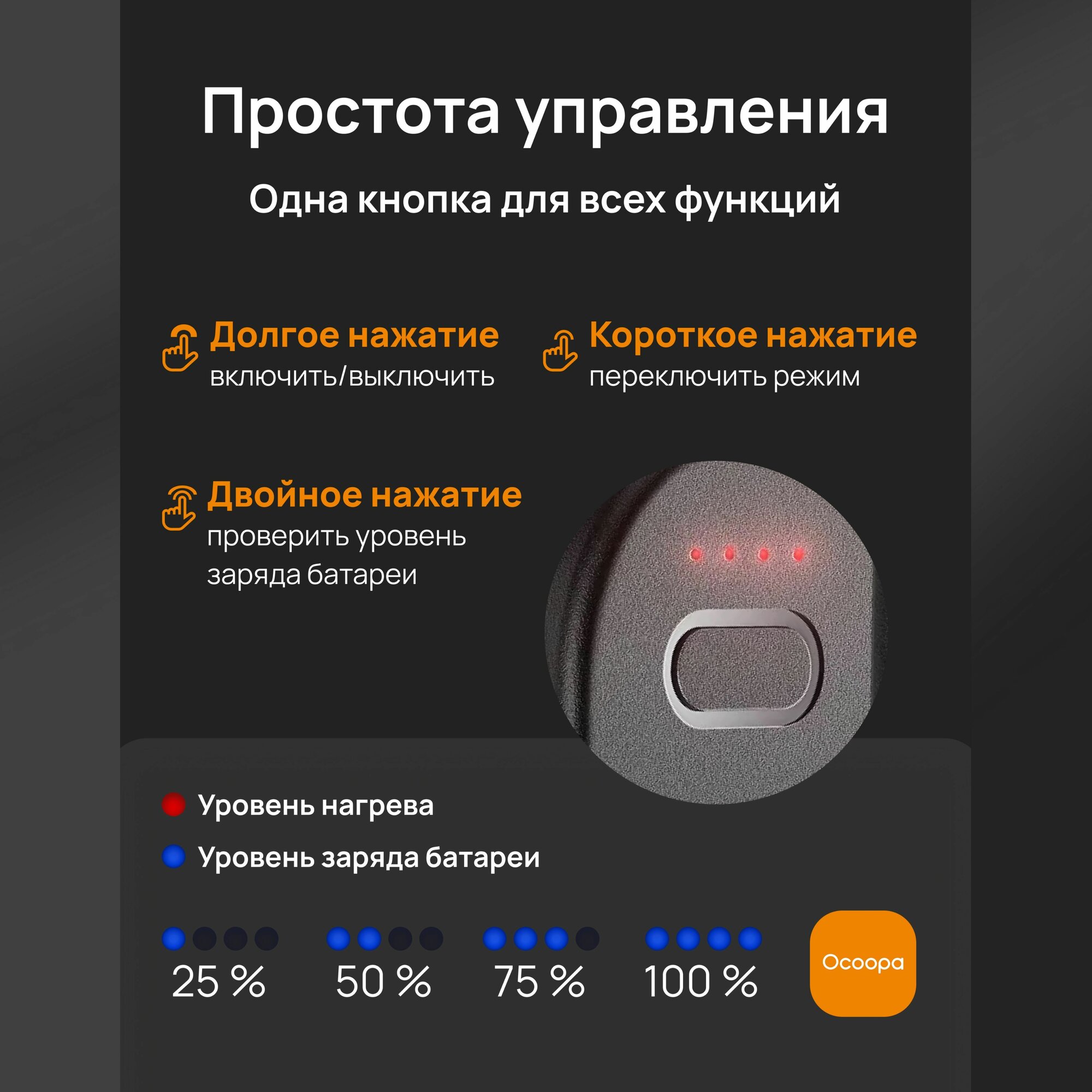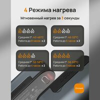 ● 4 режима нагрева. Грелки имеют 4 режима нагрева от 40 до 63°C. Выберите наиболее комфортную температуру. Для вашего удобства, гралека запоминает последний выбранный вами уровень температуры, поэтому при последующем использовании грелка автоматически выберет именно этот режим нагрева.