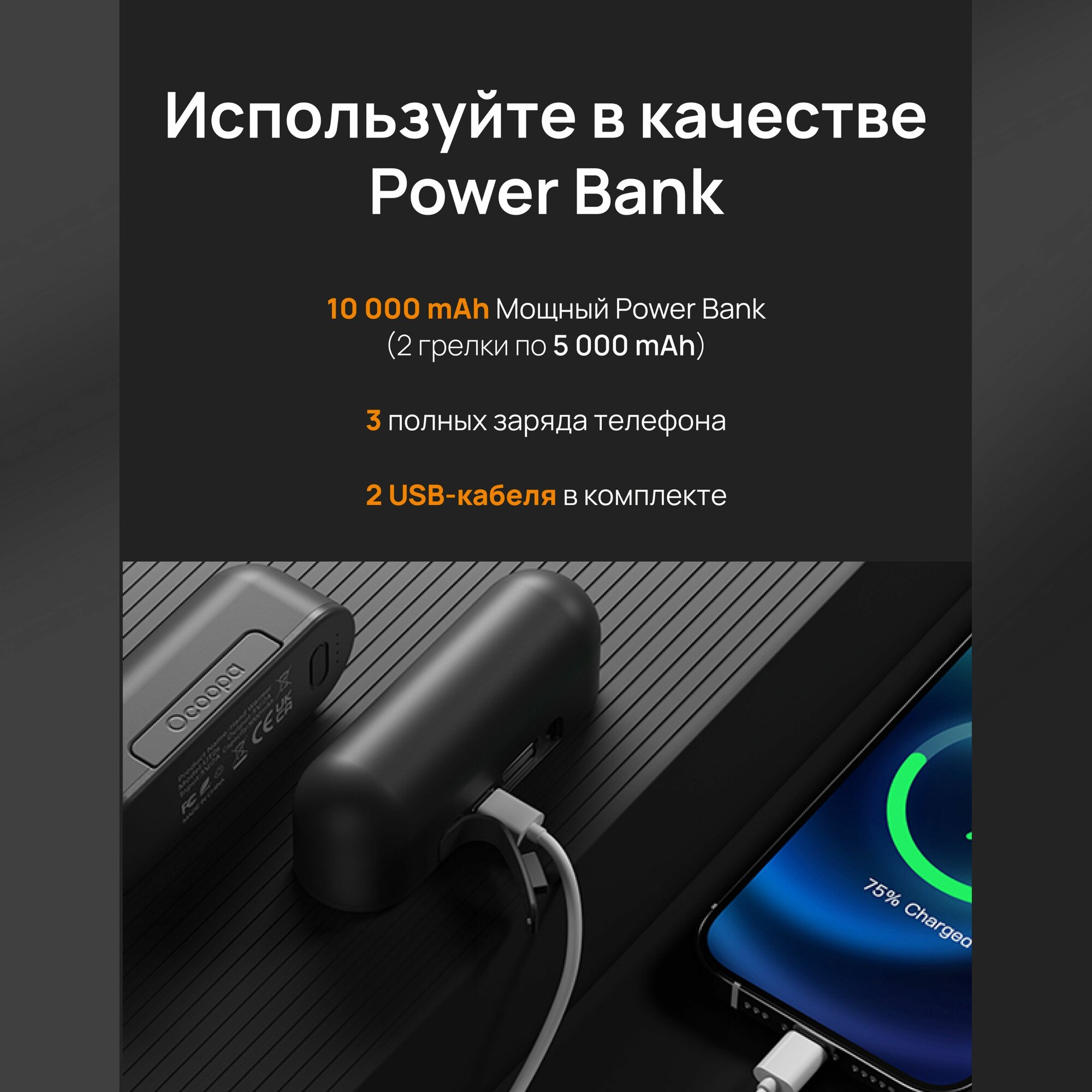 ● Используйте в качестве Power Bank. Каждая грелка Ocoopa UT2s оснащена перезаряжаемой батареей емкостью 5 000 мАч, то есть общая емкость двух грелок 10 000 мАч. Вы можете несколько раз зарядить телефон или другие устройства от каждой грелки.