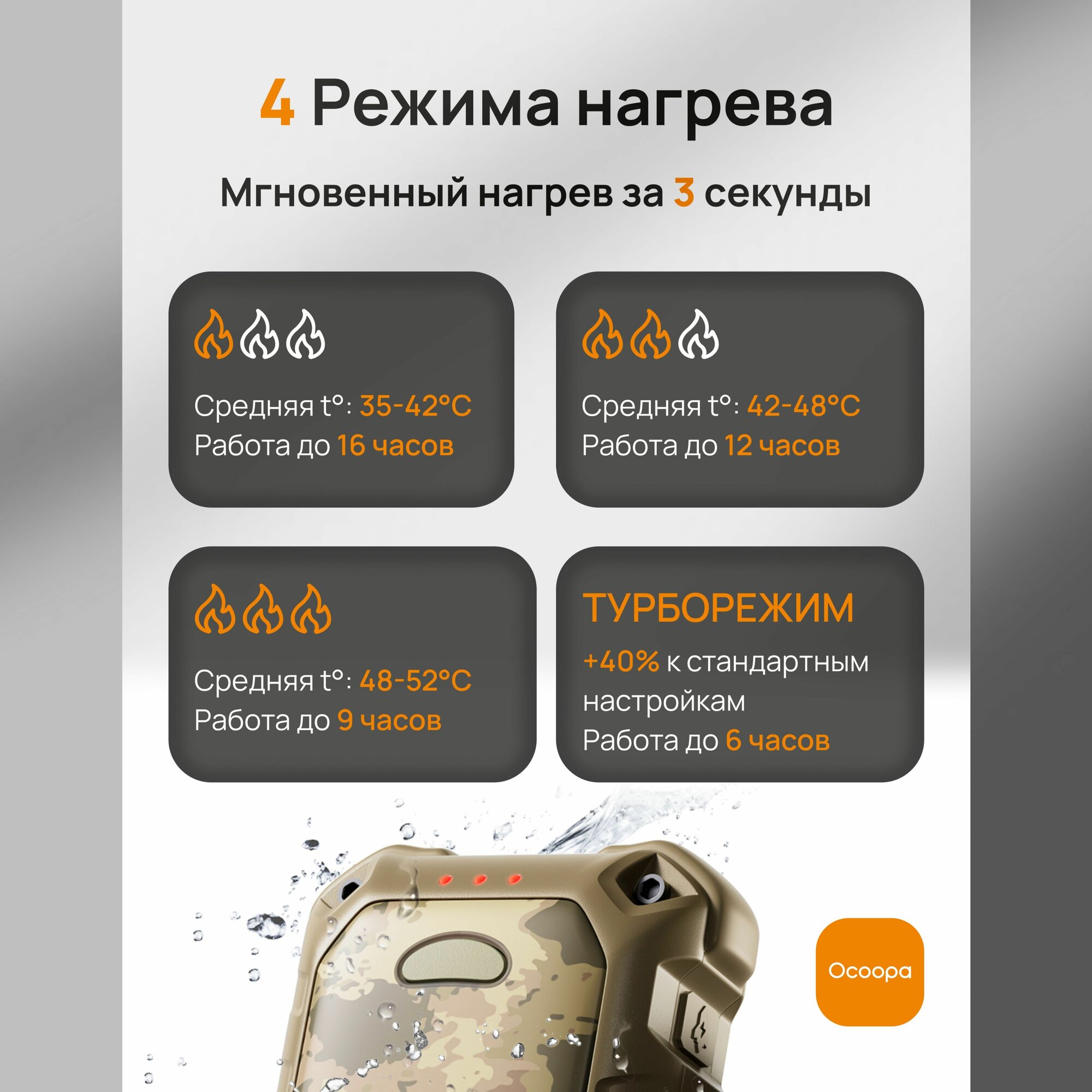 1. Мгновенное и Мощное тепло. Сердцем Ocoopa UT4 Extreme является высокоэффективная система обогрева, которая обеспечивает равномерное и быстрое распределение тепла по всей поверхности. - Быстрый нагрев: Ощутите приятное тепло всего за 3 секунды после включения. Забудьте о длительном ожидании – Ocoopa UT4 Extreme действует мгновенно. 3 режима температуры: диапазон температур от 35°C до 55°C (низкий, средний, высокий) позволяет настроить комфортный режим для любого сценария. - Двусторонний обогрев 360°: В отличие от многих аналогов, Ocoopa UT4 Extreme нагревается со всех сторон, обеспечивая максимально эффективное и приятное согревание обеих ладоней. - Интеллектуальная система контроля температуры: встроенные датчики постоянно мониторят температуру, предотвращая перегрев и поддерживая стабильный уровень тепла для вашей безопасности и комфорта.
