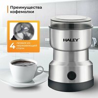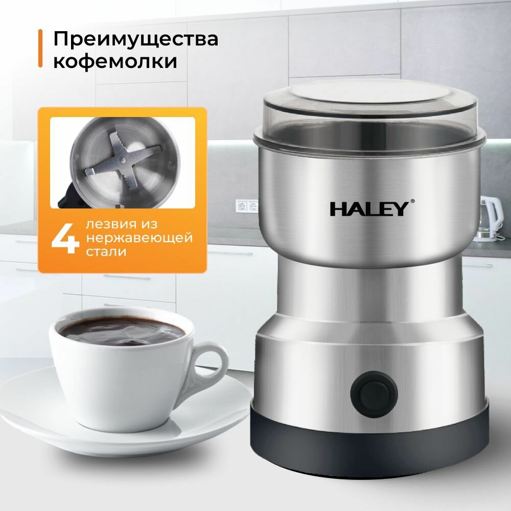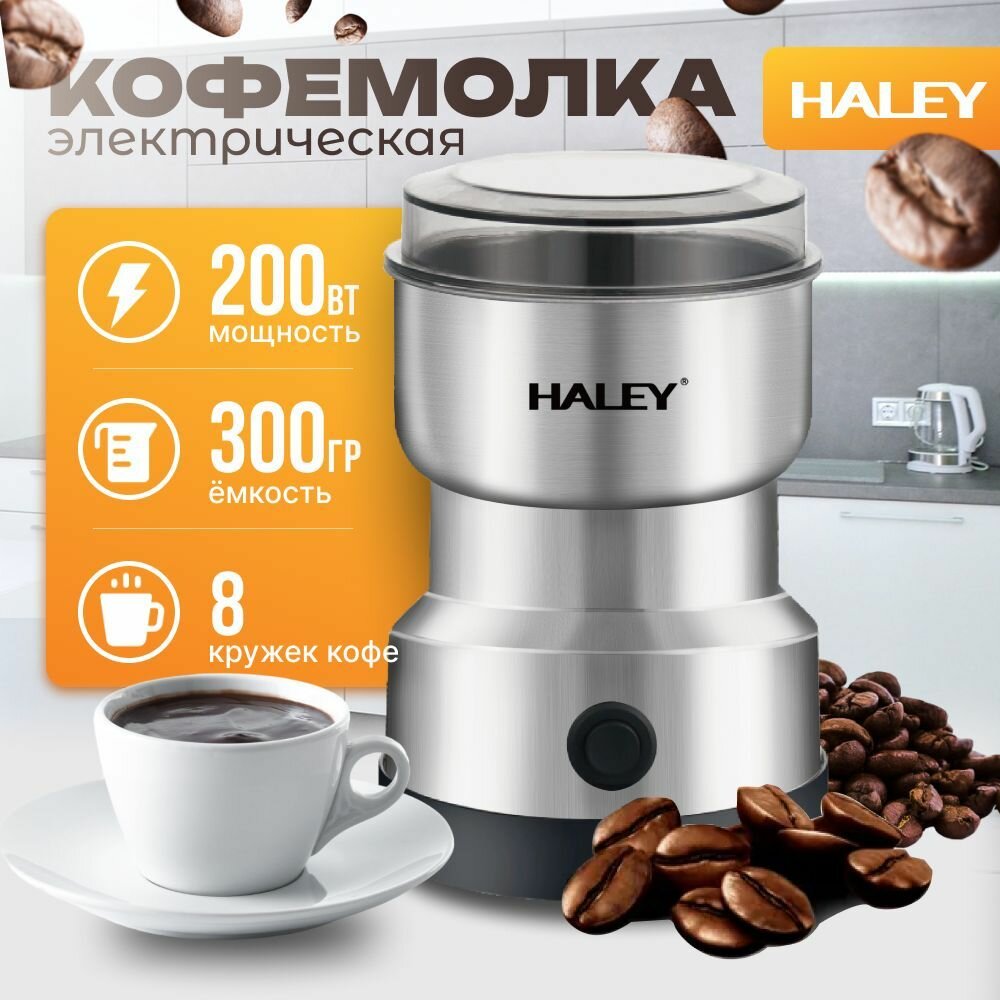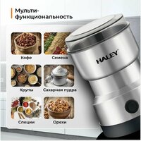 Купить Электрическая кофемолка HALEY-2114 Серебро, 200 Вт, 300 г, с ножами из нержавеющей стали и прозрачной крышкой. Подходит для кофейных зерен, круп, специй и орехов. с доставкой по всей России.