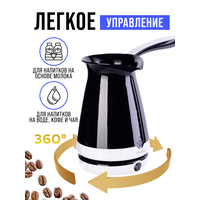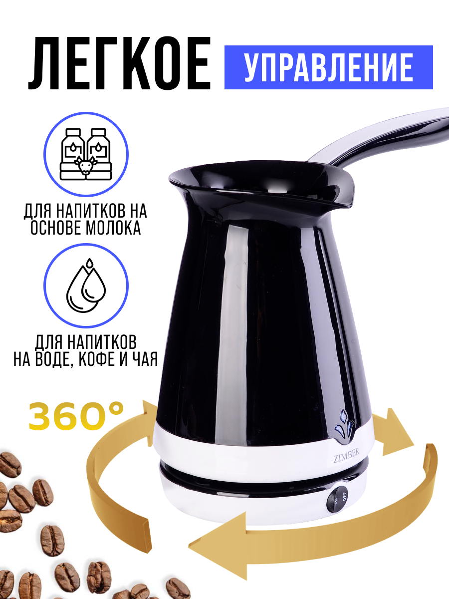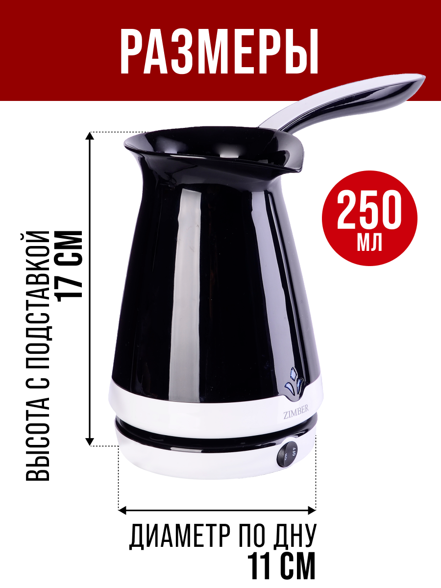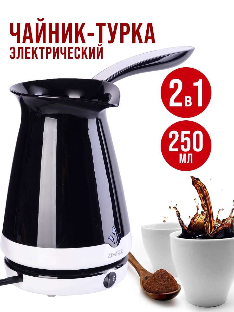 Электрическая кофеварка–турка ZIMBER - это современное, удобное и функциональное устройство для приготовления кофе. Что может быть лучше по утрам, чем чашечка этого крепкого бодрящего напитка! Далеко не всегда мы можем себе позволить тратить свое утреннее время на варку кофе в традиционной турке, но такая замечательная кофеварка-турка позволит значительно ускорить этот процесс и насладиться ароматом и вкусом любимого напитка! Кофеварка выполнена из качественного термопластика, нагревательным элементом прибора является пластина из нержавеющей стали. Стильная и удобная, такая турка украсит вашу кухню, а также станет замечательным подарком! Электрокофеварка ZM; Используемый кофе: молотый; Материал корпуса: полипропилен. ; Цвет: черный; Нагревательный элемент: пластина; Материал пластины: нержавеющая сталь; Объем: 250 мл. ; Мощность: 730-870 Вт; Напряжение: 220-240 В, 50/60 Гц; Вращение на подставке: на 360°; Индикатор включения: есть; Тип питания: от сети; Размер упаковки: 24,4 х 13,1 х 1.