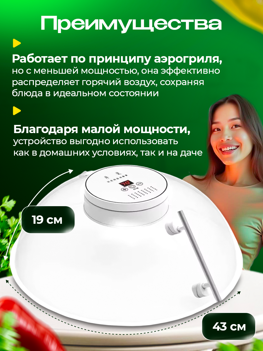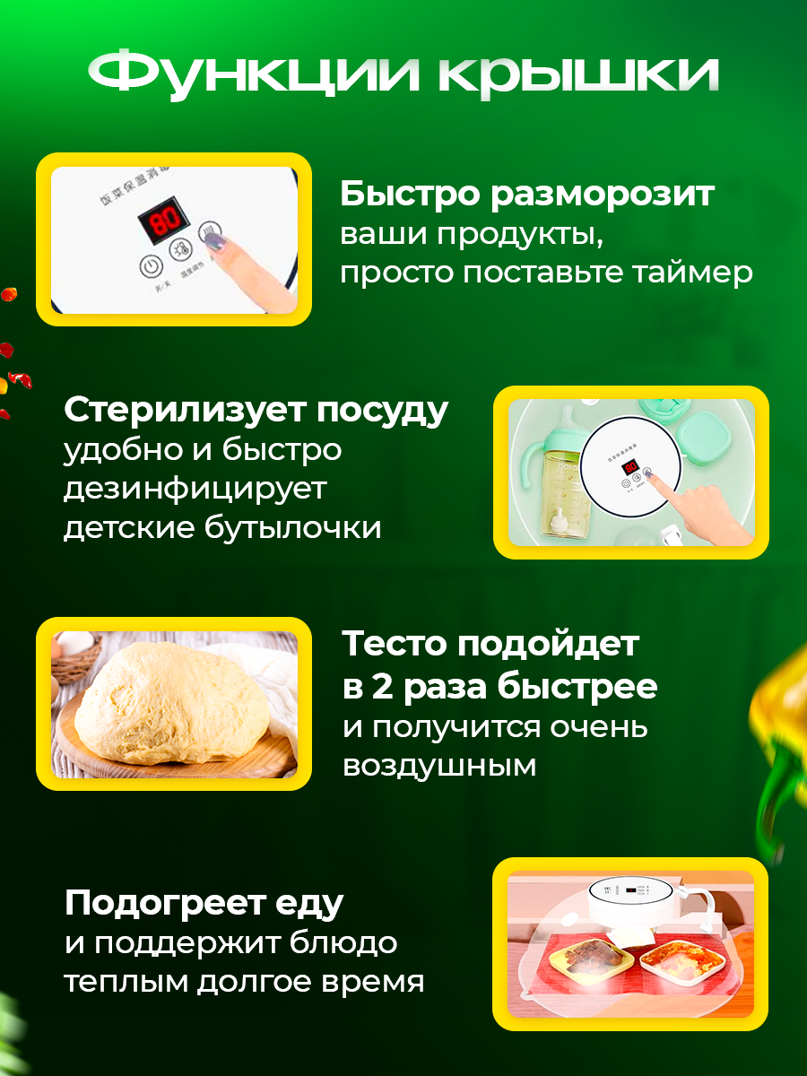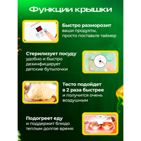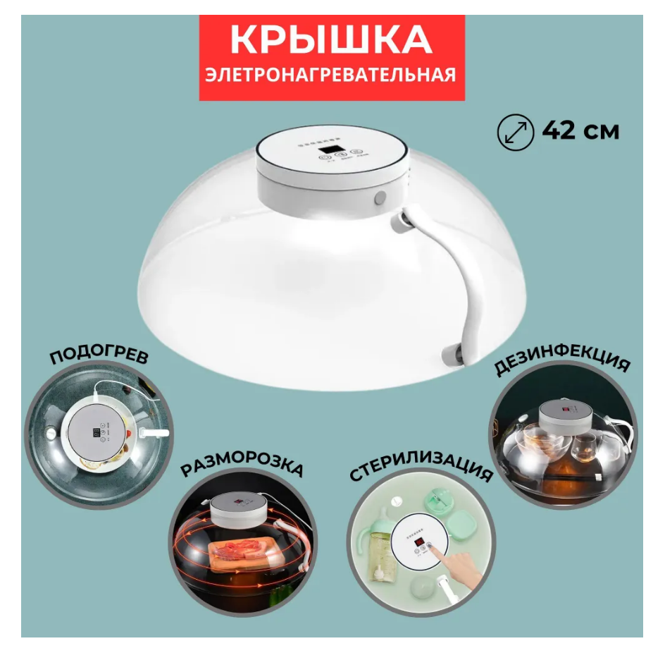 Преимущества: Экономичность: Благодаря малой мощности, устройство выгодно использовать как в домашних условиях, так и на даче. Поддержка температуры: Овощи, мясо и другие блюда остаются горячими и свежими. Быстрая разморозка: Позволяет сэкономить время при подготовке продуктов. Стерилизация: Идеально для стерилизации детских бутылочек и посуды, обеспечивая высокие стандарты гигиены. Удобство: Простой в использовании и подключается к стандартной сети 220 вольт. Эта крышка станет полезным помощником на вашей кухне, сочетая функциональность и удобств
