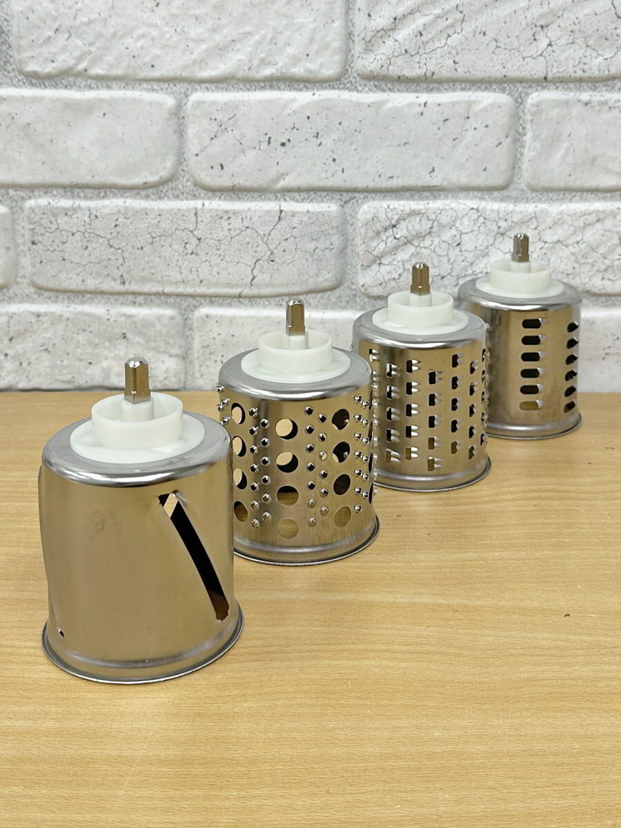 - Насадка-овощерезка со сменными ножами. В комплект входит насадка-овощерезка со сменными ножами типа "стакан" – 3 ножа-терки и 1 слайсер. Производительность - 300 г/мин. Насадка-овощерезка вставляется вместо стандартной насадки.