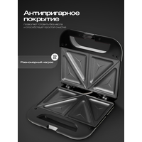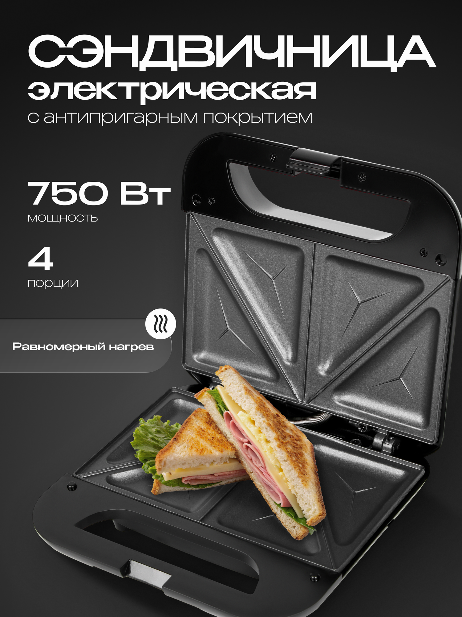 Мощность 750 Вт позволяет быстро нагревать устройство и готовить сэндвичи за несколько минут.