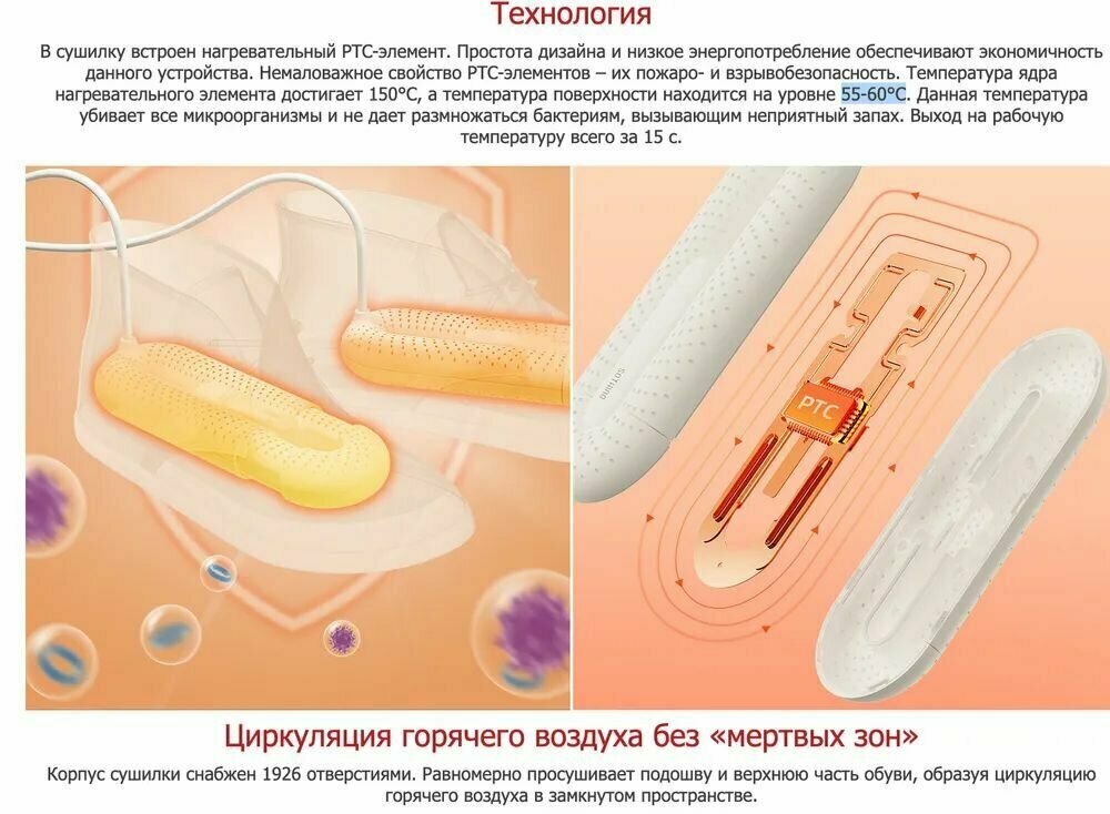 Распространение тепла на 360°; сушка обуви при постоянной температуре; безопасный нагревательный элемент; керамические нагреватели достигают температуры до 150 градусов, при этом на поверхности поддерживаются постоянные 55 градусов; для лучшего распределения тепла поверхность вкладышей перфорирована; таймер на 3, 6 или 9 часов; долговечный огнестойкий пластик ABS UL94 VO; номинальная частота: 250-50 Гц;