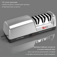 Автоматическая точилка проста в использовании и сделает все сама, просто проведите лезвие от ручки к кончику острия через каждый слот. Электрическое точило подходит для стальных и керамических кухонных ножей, не требует опыта и навыков. Точит под углом 15 градусов.