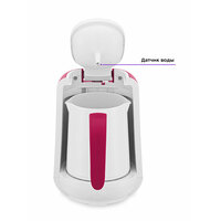 Электрическая турка КТ-7135 варит кофе по-турецки. С ней вы сможете быстро и легко сварить натуральный кофе на 4 чашки по 60 мл. Для разного количества чашек у турки есть предустановленное время работы, по истечении которого турка автоматически отключается. Если пенка поднялась раньше установленного времени, прибор отключится. Для этого у электрической турки есть датчик воды. Ручка турки пластиковая, не нагревается и удобно лежит в руке. У турки 2 носика, это сделано специально, чтобы вам было удобно наливать кофе в чашку вне зависимости от того, правша вы или левша. Турка рассчитана на 1–4 порции кофе. Предустановленное время: для 1 чашки — 1 минута 20 секунд, для 2 чашек — 2 минуты 10 секунд, для 3 чашек — 3 минуты, для 4 чашек — 3 минуты 50 секунд.
