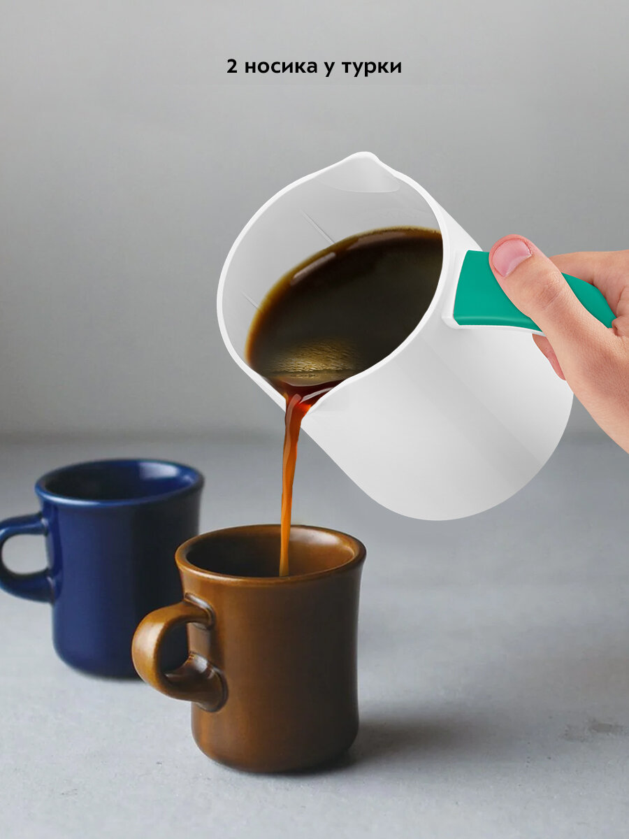 Электрическая турка КТ-7135 варит кофе по-турецки. С ней вы сможете быстро и легко сварить натуральный кофе на 4 чашки по 60 мл. Для разного количества чашек у турки есть предустановленное время работы, по истечении которого турка автоматически отключается. Если пенка поднялась раньше установленного времени, прибор отключится. Для этого у электрической турки есть датчик воды. Ручка турки пластиковая, не нагревается и удобно лежит в руке. У турки 2 носика, это сделано специально, чтобы вам было удобно наливать кофе в чашку вне зависимости от того, правша вы или левша. Турка рассчитана на 1–4 порции кофе. Предустановленное время: для 1 чашки — 1 минута 20 секунд, для 2 чашек — 2 минуты 10 секунд, для 3 чашек — 3 минуты, для 4 чашек — 3 минуты 50 секунд.