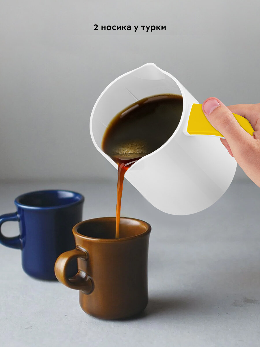 Электрическая турка КТ-7135 варит кофе по-турецки. С ней вы сможете быстро и легко сварить натуральный кофе на 4 чашки по 60 мл. Для разного количества чашек у турки есть предустановленное время работы, по истечении которого турка автоматически отключается. Если пенка поднялась раньше установленного времени, прибор отключится. Для этого у электрической турки есть датчик воды. Ручка турки пластиковая, не нагревается и удобно лежит в руке. У турки 2 носика, это сделано специально, чтобы вам было удобно наливать кофе в чашку вне зависимости от того, правша вы или левша. Турка рассчитана на 1–4 порции кофе. Предустановленное время: для 1 чашки — 1 минута 20 секунд, для 2 чашек — 2 минуты 10 секунд, для 3 чашек — 3 минуты, для 4 чашек — 3 минуты 50 секунд.