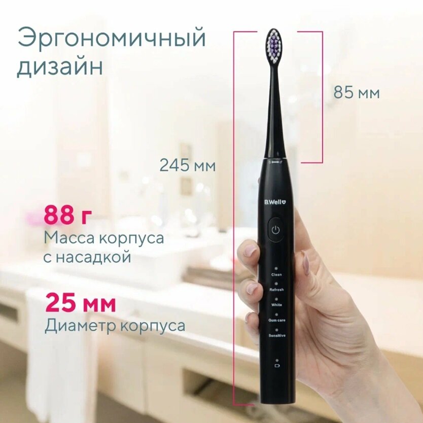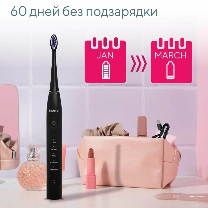 Купить Электрическая зубная щетка B.Well PRO-850, звуковая, премиальная щетина DuPont средней жесткости, 5 режимов, 60 дней без подзарядки, 2 насадки, черная с доставкой по всей России. Электрическая зубная щетка B.Well PRO-850, звуковая, премиальная щетина DuPont средней жесткости, 5 режимов, 60 дней без подзарядки, 2 насадки, черная: сравнение цен, характеристики, фото, актуальное наличие и цены.