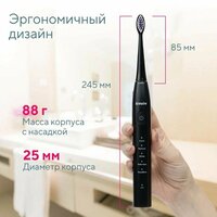 Звуковая зубная щетка выполнена в стильном дизайне и станет оригинальным подарком для себя и близких. Зубная щетка PRO-850 обладает пониженным уровнем вибрации в корпусе, что упрощает процесс привыкания к звуковой щетке для новичков и делает процедуру ежедневной чистки зубов более комфортной для опытных пользователей. Электрическая зубная щетка детская подходит для использования с 8 лет.
