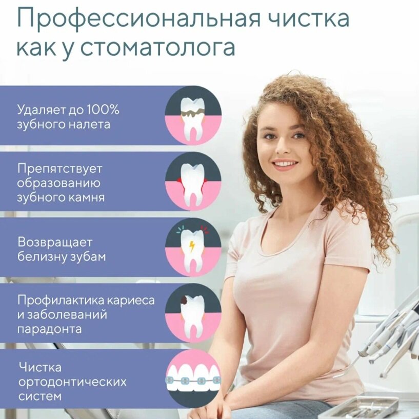 Высокая частота вибрации до 39 600 кол/мин позволяет бережно удалять до 100% зубного налета и осветлить эмаль на 1-2 тона. Подходит для профилактики и удаления зубного камня.