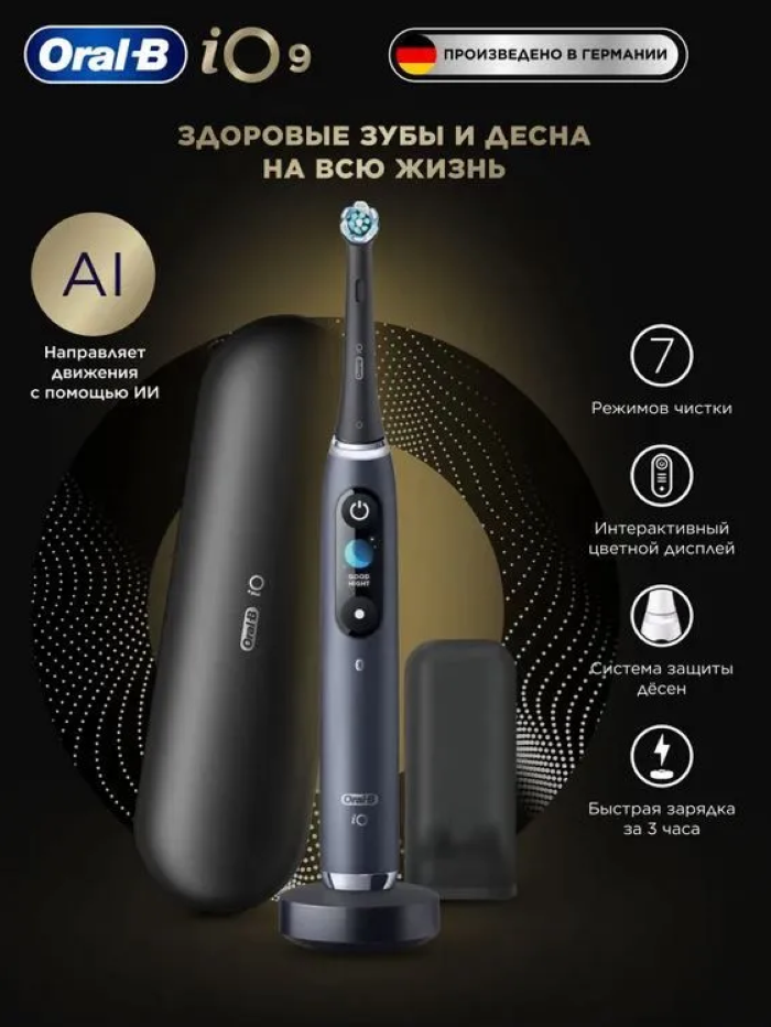 Электрическая зубная щетка ORAL-B iO S9 черная с 7 режимами чистки предназначена для обеспечения максимальной гигиены полости рта. Ее инновационная технология сочетает в себе круговую насадку с бережными микровибрациями, что позволяет добиться отличных результатов в уходе за зубами и деснами, делая процесс чистки более комфортным и эффективным. Щетка оснащена множеством современных функций. Среди них 7 режимов чистки, включая ежедневную, для чувствительных зубов, отбеливание и другие, что позволяет пользователю персонализировать уход. Встроенная магнитная технология обеспечивает быструю зарядку всего за три часа, а встроенный аккумулятор обеспечивает работу устройства до 14 дней без подзарядки. Интерактивный цветной дисплей на щетке отображает текущий режим, индикатор заряда и напоминает о необходимости смены насадки. Система защиты десен благодаря умному датчику давления контролирует уровень давления на зубы, предотвращая его чрезмерное или недостаточное приложение, уберегая десны и эмаль от повреждений. Технология 3D отслеживания движения и искусственный интеллект помогают контролировать зоны чистки и формируют отчеты о качестве ухода, что активно способствует улучшению гигиенических привычек. В комплект входит заряжаемый дорожный футляр и чехол для насадок, что делает зубную щетку удобной для использования в поездках. Благодаря водонепроницаемой конструкции и эргономичной ручке, щетку можно использовать во влажных условиях, например, в душе. Рекомендуется менять насадку каждые три месяца для достижения наилучших результатов.