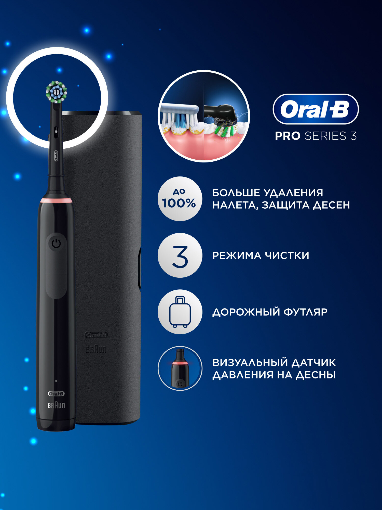 | Подробная комплектация | зубная щетка Oral-B Pro 3, зарядное устройство, насадка Cross Action (1шт.), дорожный футляр, инструкция по эксплуатации, гарантийный талон |