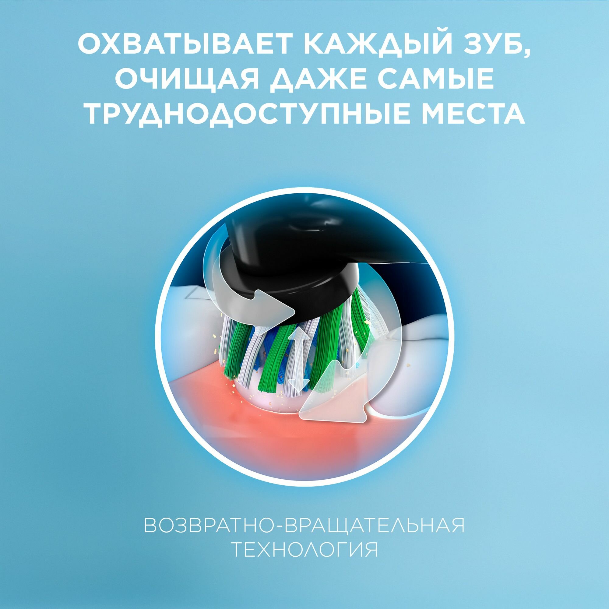 • возвратно-вращательная технология чистки 3D от ORAL-B: щётка вибрирует, крутится и пульсирует, совершая 8800 возвратно-вращательных и 40.000 пульсирующих движений в минуту и удаляя до 100% больше налета по сравнению с обычной щёткой;