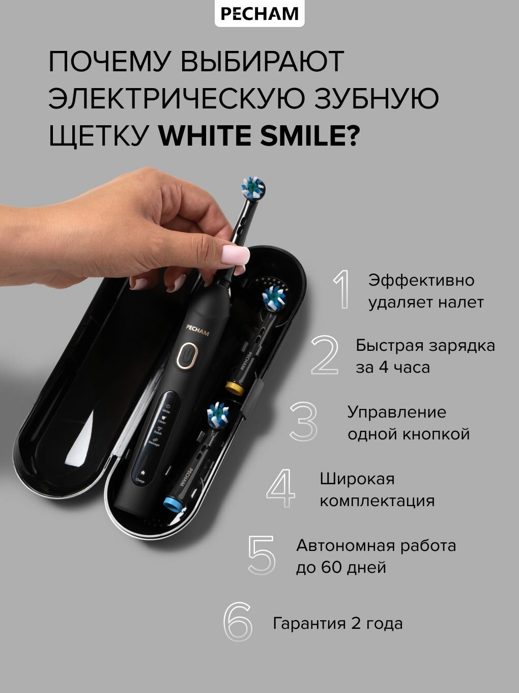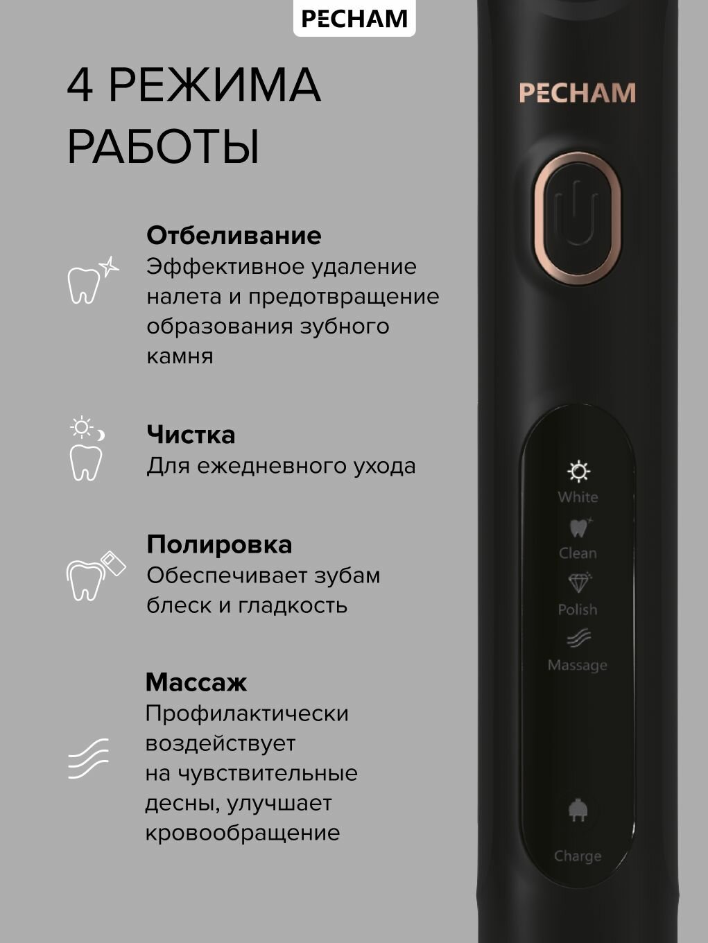 | Режимы работы | деликатная чистка, ежедневная чистка, массаж, отбеливание, полировка |