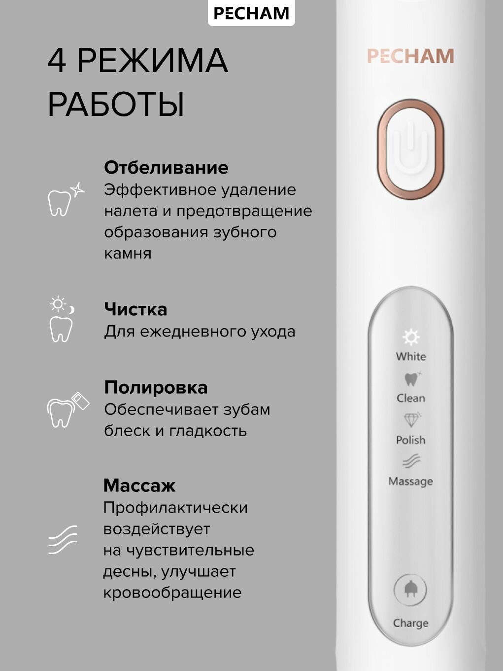| Режимы работы | деликатная чистка, ежедневная чистка, массаж, отбеливание, полировка |