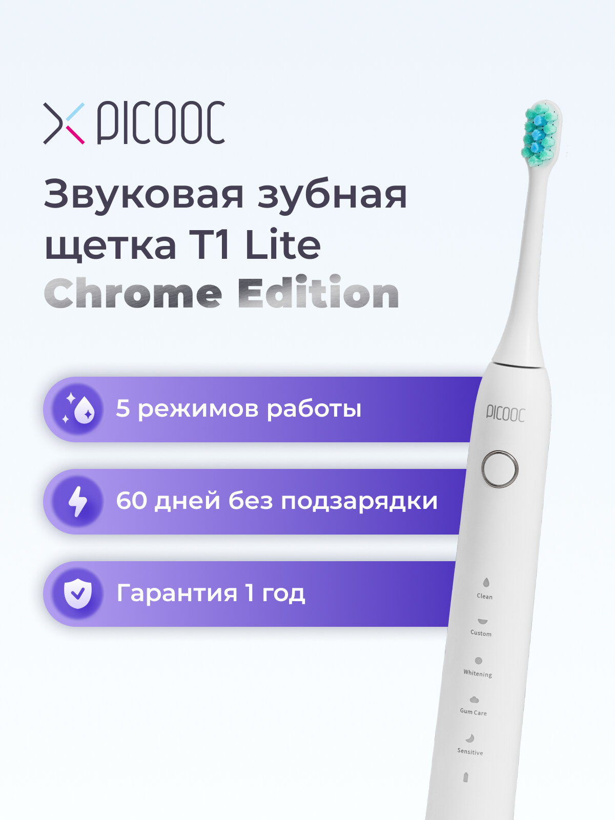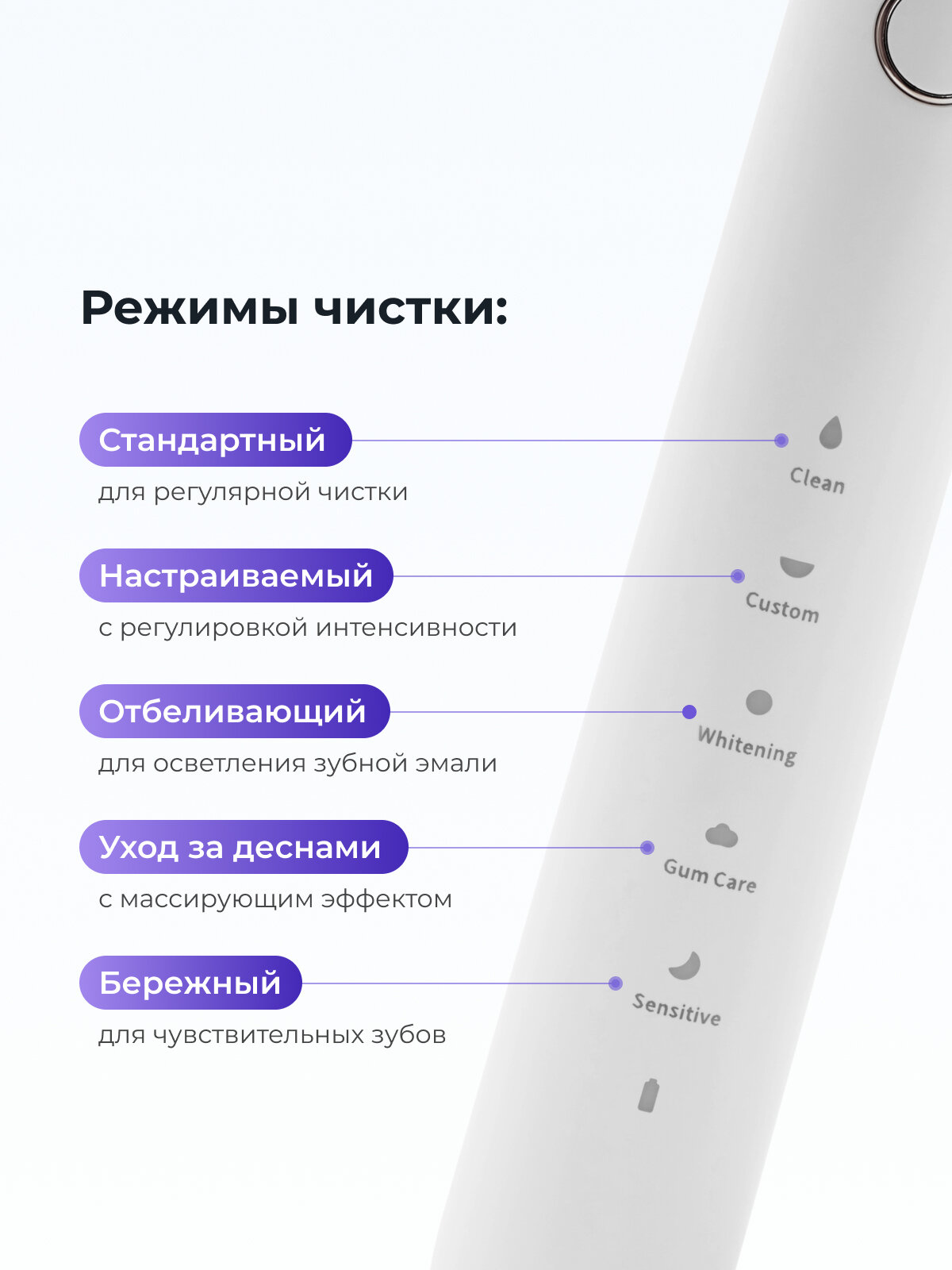 | Режимы работы | деликатная чистка, ежедневная чистка, отбеливание, уход за деснами |
