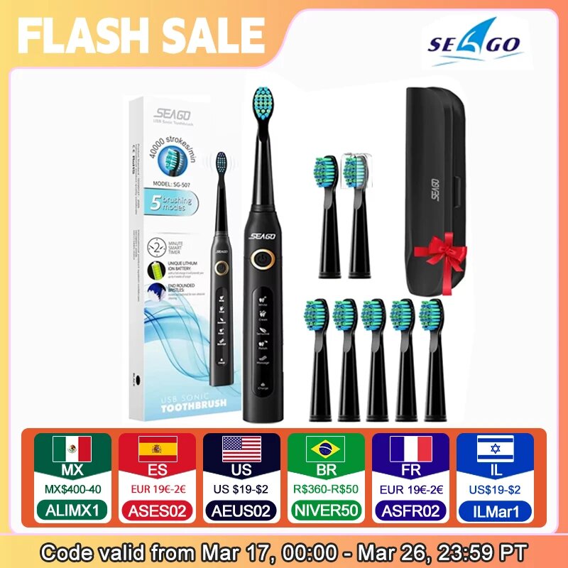 Купить Электрическая зубная щетка Seago Sonic SG-507, 5 режимов работы, цвет и комплектация на выбор, black pink box head с доставкой по всей России.