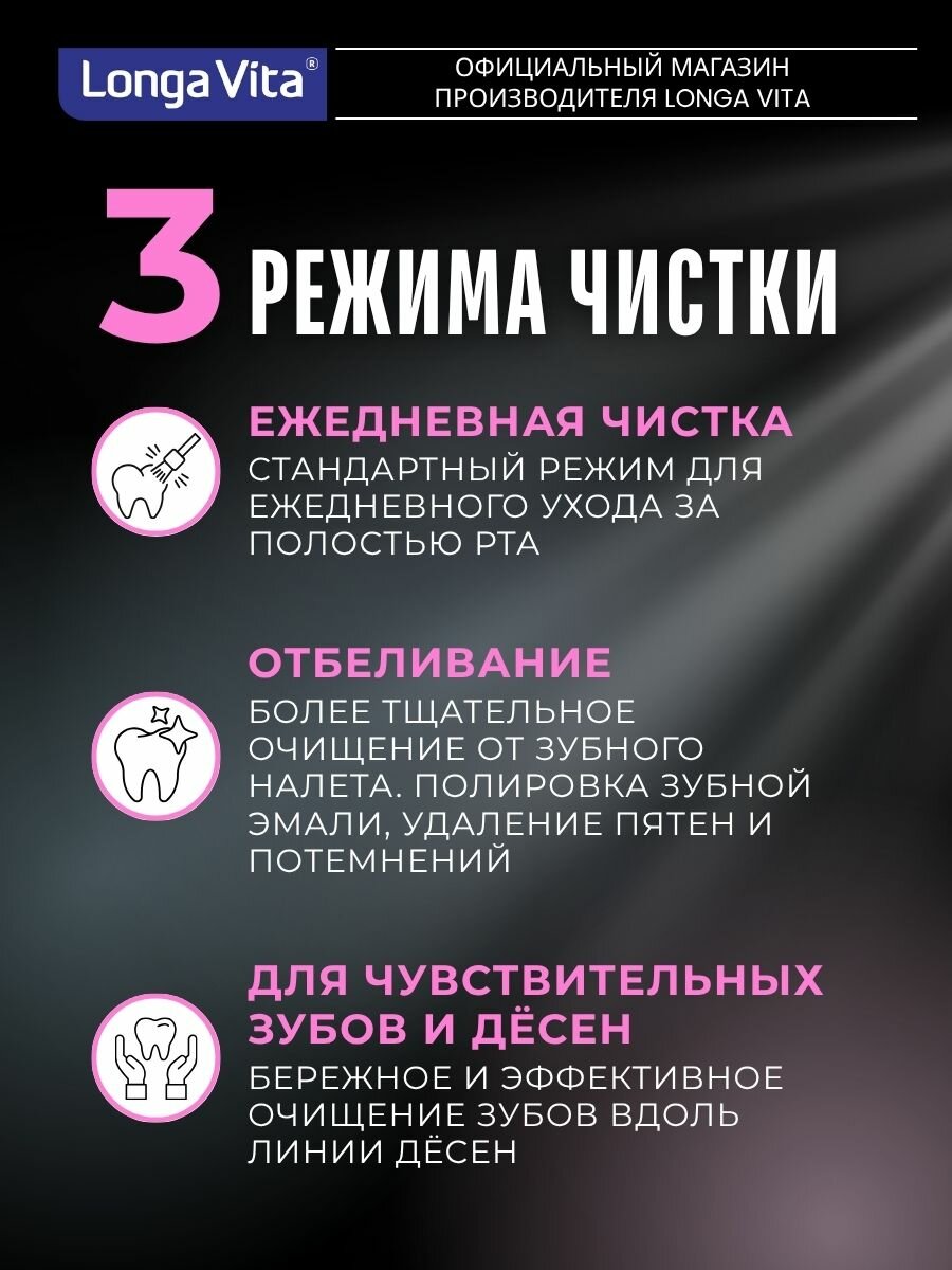 | Режимы работы | деликатная чистка, ежедневная чистка, массаж, отбеливание, полировка, уход за деснами, чистка языка |