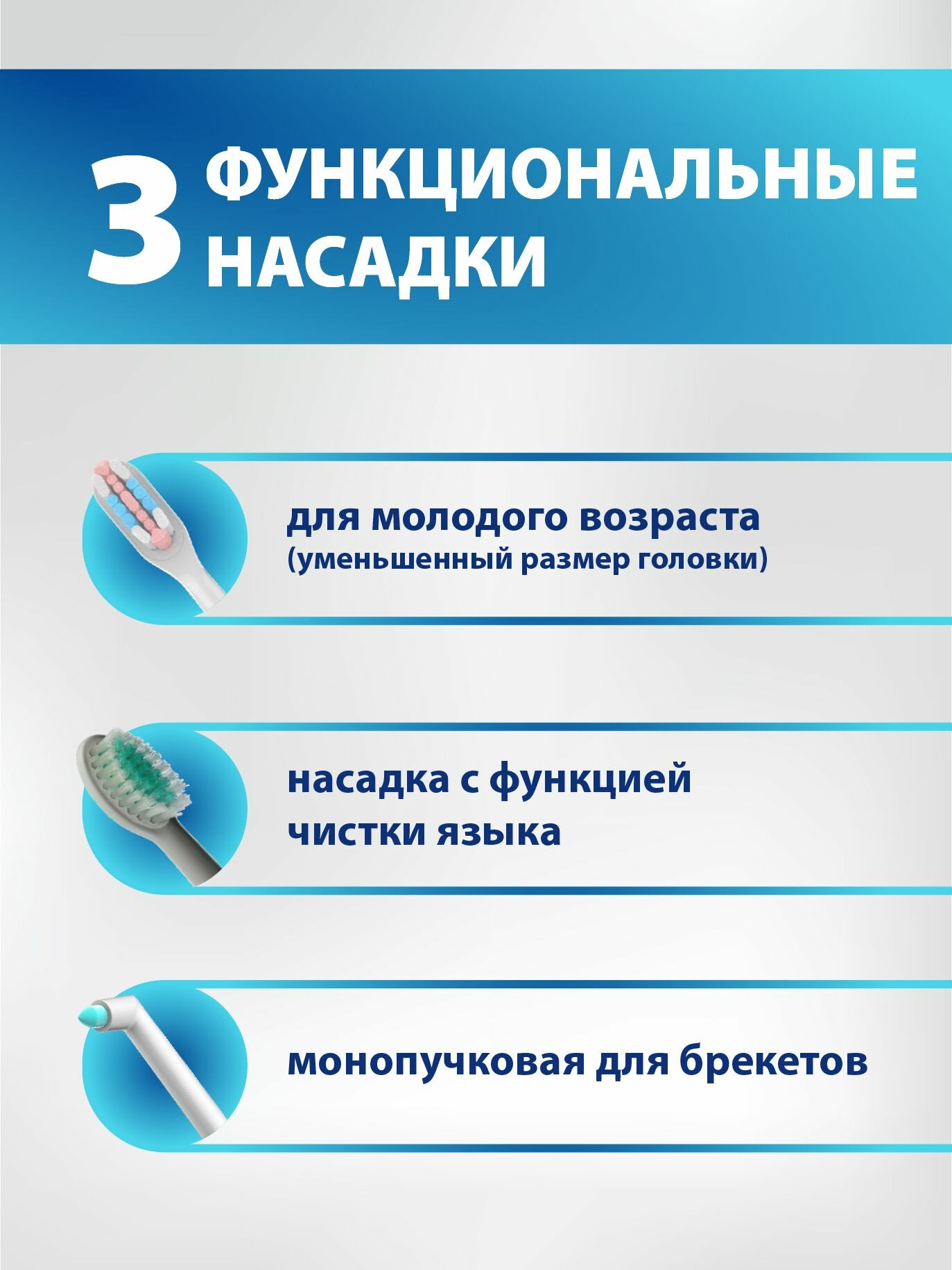 - встроенный таймер – помогает контролировать время чистки зубов в течение 2 минут и сигнализирует каждые 30 секунд о необходимости сменить зону чистки