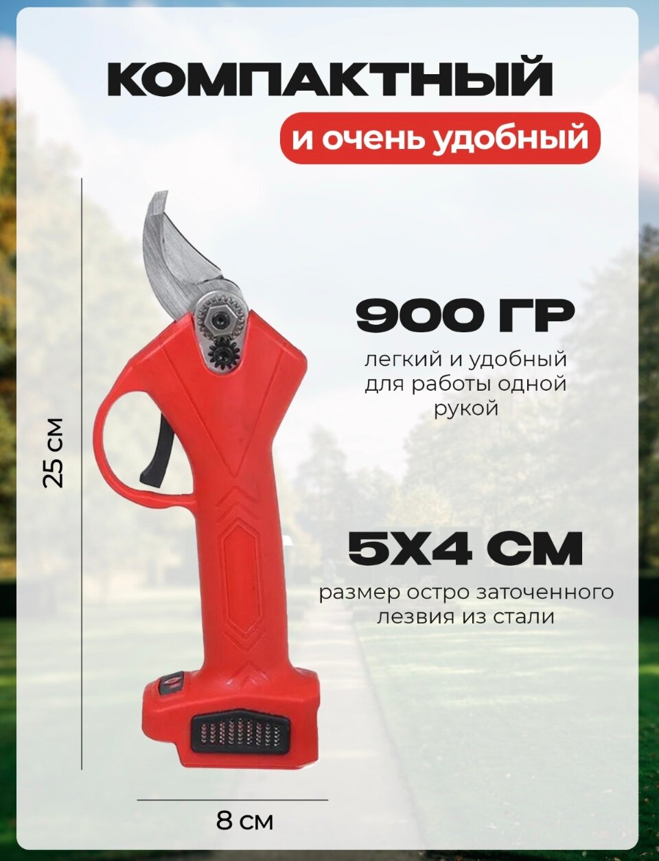 **Представляем вам электрические ножницы высочайшего качества!** Эти лёгкие и портативные ножницы разработаны с учётом человеческого фактора: их ручка имеет эргономичный дизайн, что делает их удобными в использовании и экономит ваши усилия. Они идеально подходят для обрезки веток в фруктовых садах, виноградниках и других местах. С помощью этих ножниц вы сможете быстро и эффективно обрезать ветви диаметром от 0 до 30 мм. Они значительно превосходят по качеству обрезки традиционные ручные секаторы. Основные преимущества этих ножниц: * Быстрая резка и удобство использования; * Небольшой размер и беспроводная конструкция для удобства переноски; * Повышение эффективности работы; * Противоскользящая рукоятка, соответствующая человеческому инженерному дизайну, обеспечивает простоту использования и экономию усилий; * Прекрасный эффект рассеивания тепла и низкий уровень шума для длительного срока службы; * Высокая эффективность, повышение производительности и снижение производственных затрат; * Стальное заточенное режущее лезвие для прочности, коррозионной стойкости и износостойкости; * Поддержка срезания ветвей и веток диаметром от 0 до 30 мм; * Литиевая батарея большой ёмкости 21V 2000mAh, которая обеспечивает до 4-5 часов работы после 1-1,5 часов зарядки. В комплекте также идёт запасная батарея. Эти ножницы можно использовать для сбора фруктов, садоводства, обрезки цветочного рынка, сбора урожая на ферме и многого другого. **Технические характеристики:** * Название: электрические ножницы * Материал: пластик + сталь 45 # Цвет: красный * Рабочее напряжение: 21 В * Зарядное напряжение: 110-220 В * Батарея: 2 * литиевая аккумуляторная батарея, 21 В, 1200 мАч * Время зарядки: 1-1,5 часа * Время работы: 4-5 часов * Номинальная мощность: 100 Вт * Максимальная мощность: 800 Вт * Режущая способность: диаметр от 0 до 30 мм * Рабочая температура: от -10°C до 65°C / 14°F -149°F * Размер изделия: 252 * 91 * 55 мм / 9,92 * 3,58 * 2,17 дюйма * Размер упаковки: 295 * 90 * 255 мм / 11,61 * 3,54 * 10,04 дюйма * Вес упаковки: 2080 г / 4,59 фунта.
