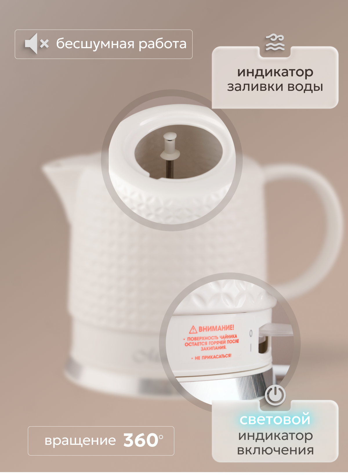 | Особенности | бесшумное закипание, вращение на 360 градусов, индикация включения, отсек для хранения шнура |