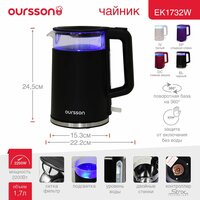 Купить Электрический стеклянный чайник Oursson KE1732W/BL, 2200 Вт, 1.7л, пластик/стекло, черный с доставкой по всей России.