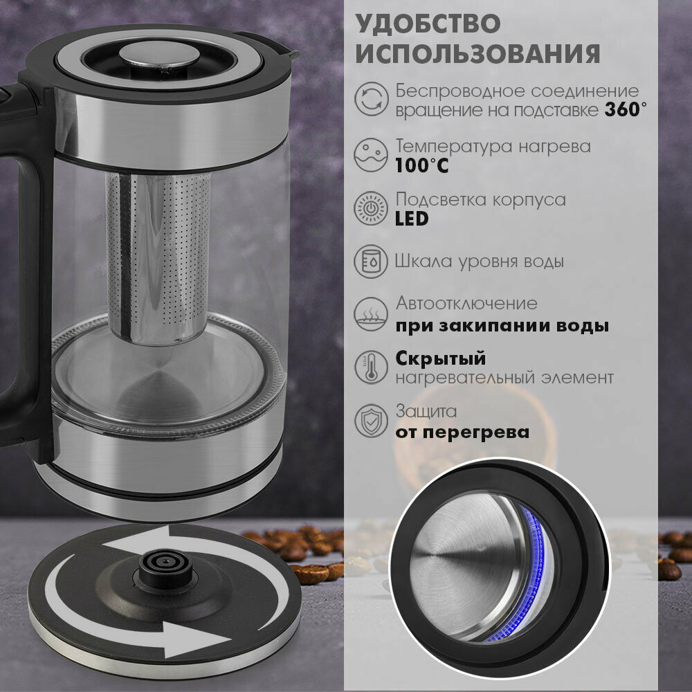 | Особенности | бесшумное закипание, вращение на 360 градусов, дисплей, заварочный фильтр, заварочный чайник, индикатор уровня воды, индикация включения, отсек для хранения шнура, сенсорное управление, съемная крышка, фильтр |