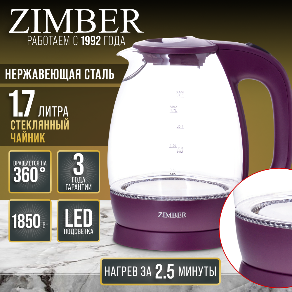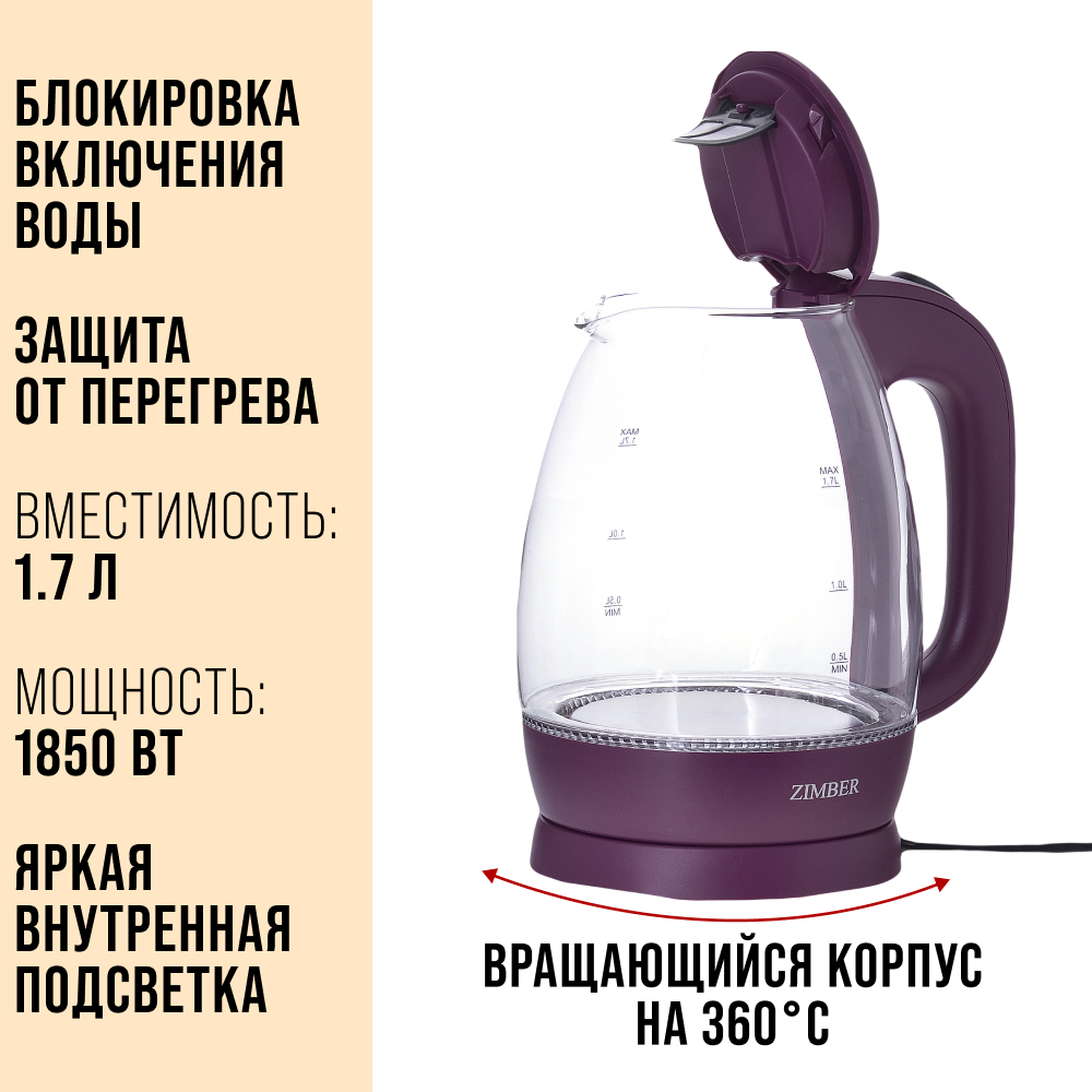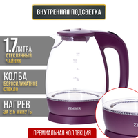 Купить Электрический чайник ZIMBER, 1,7 литра, с подсветкой и вращением на 360°, стекло, фиолетовый с доставкой по всей России.