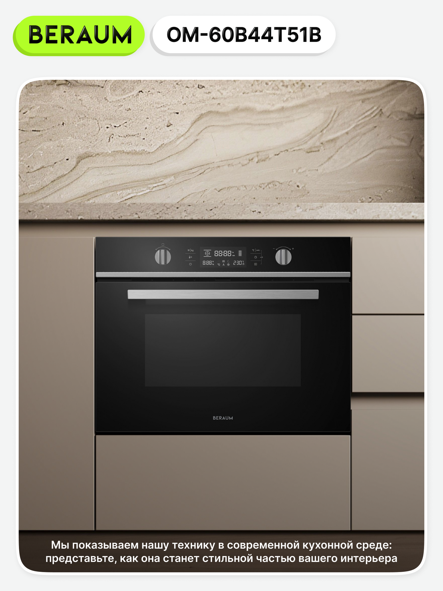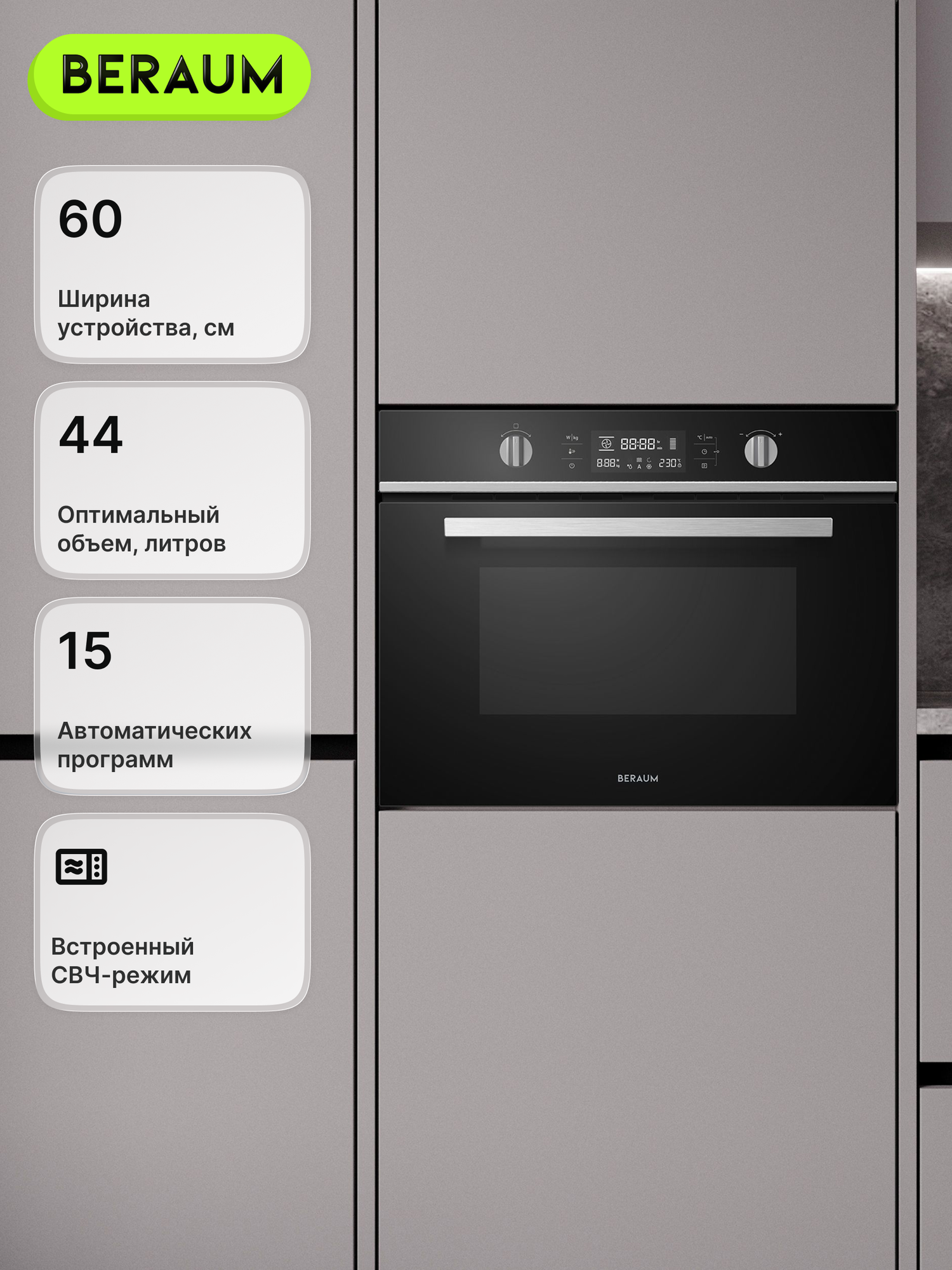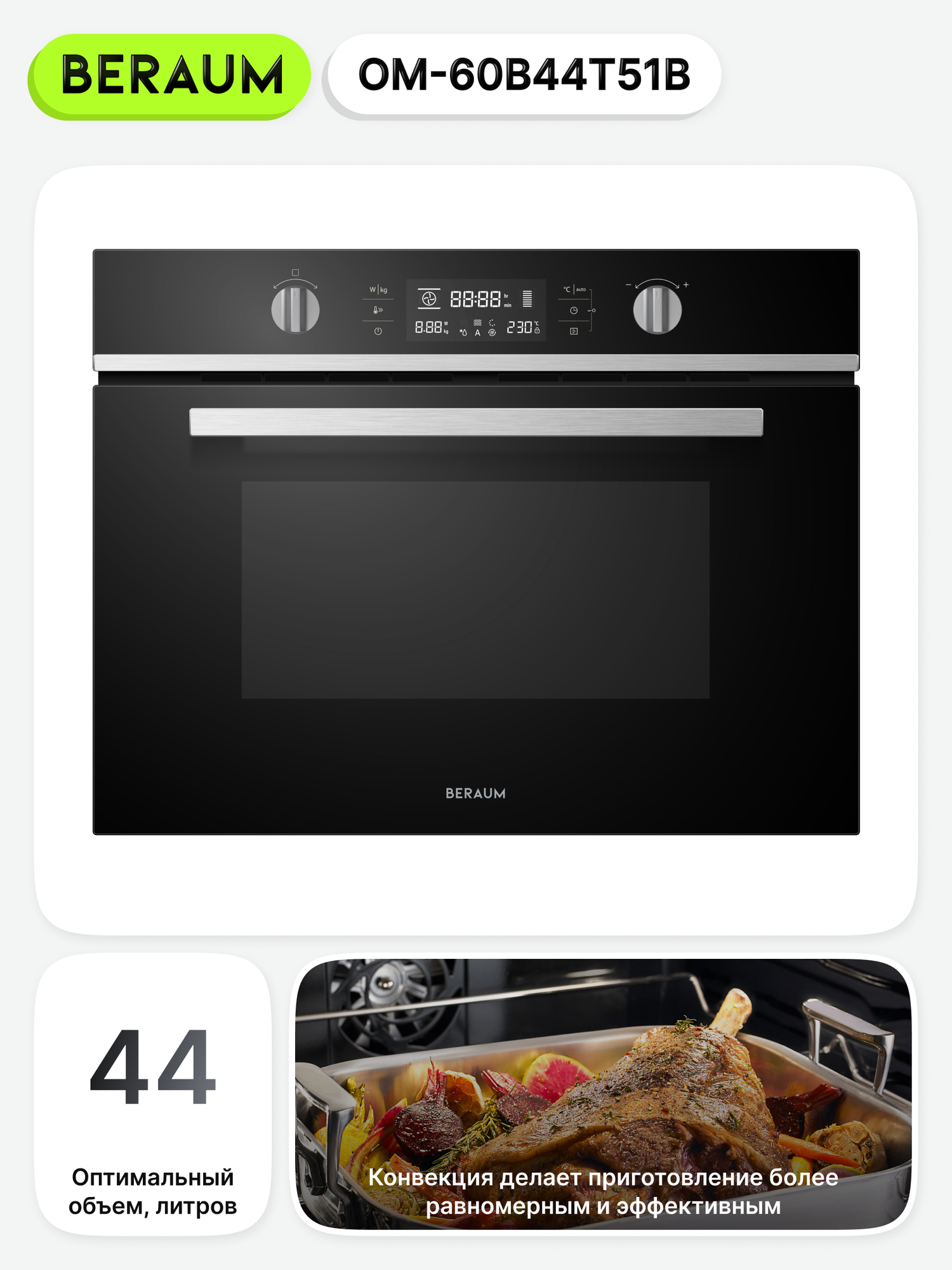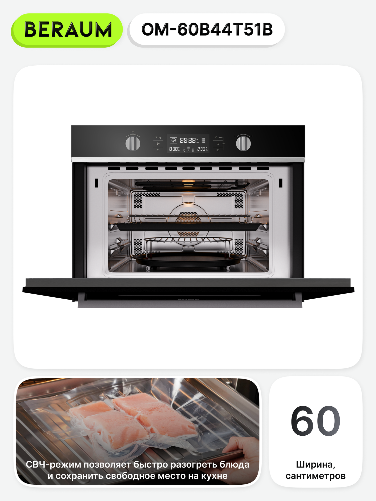 Электрический духовой шкаф Beraum OM-60B44T51B с СВЧ, объем 44 л, поворотный стол и защита от детей, 60 см: сравнение цен, характеристики, фото, актуальное наличие и цены.