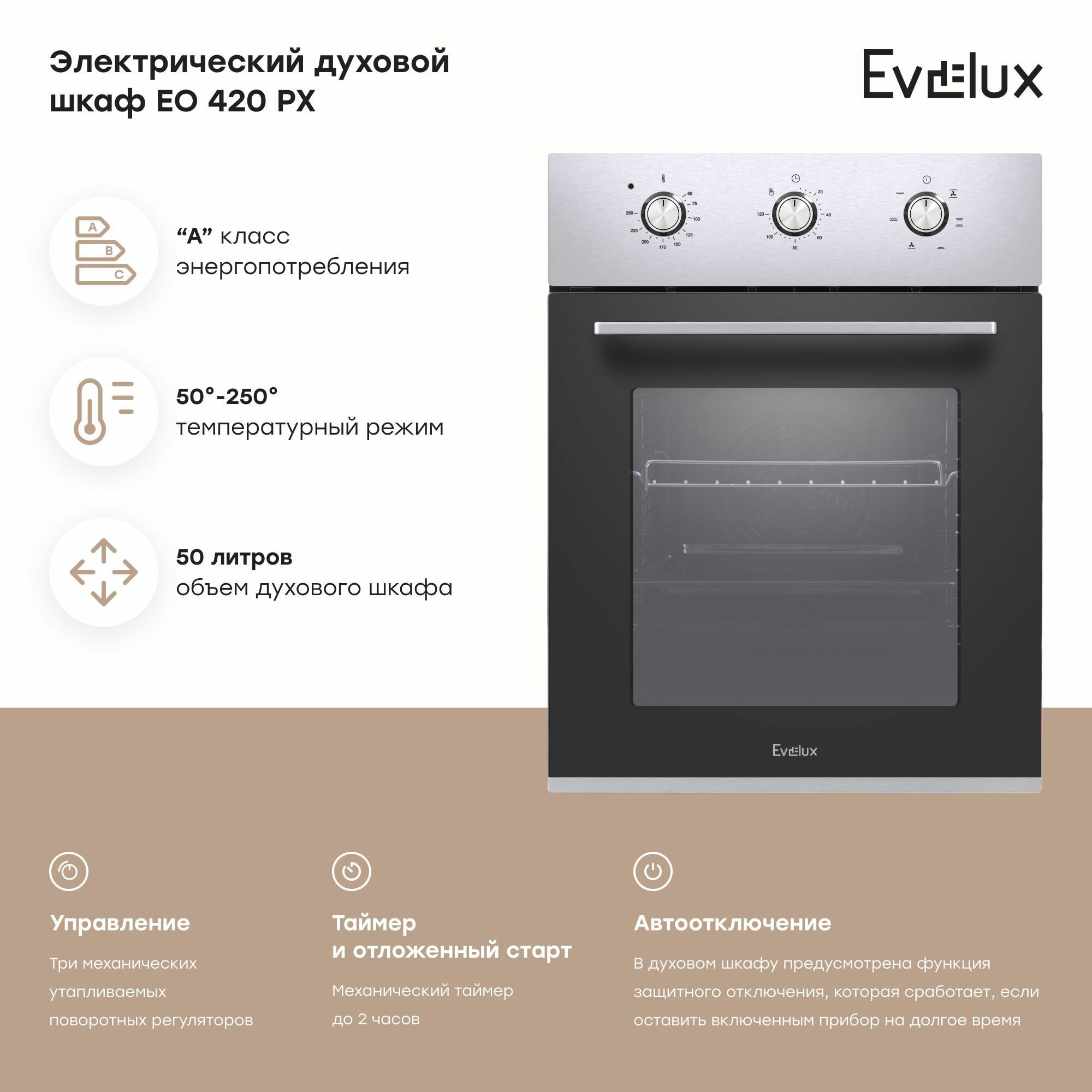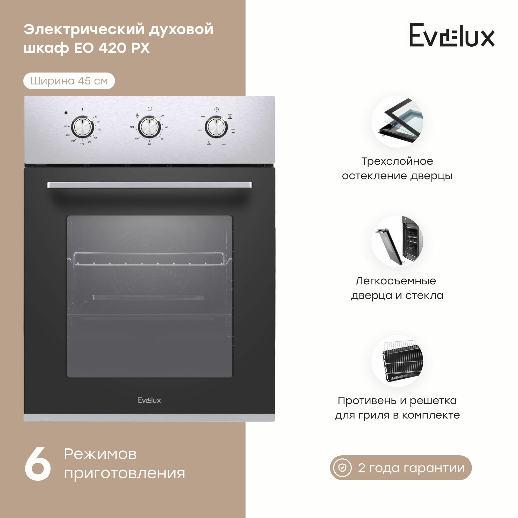 Купить Электрический духовой шкаф встраиваемый Evelux EO 420 PX с доставкой по всей России. Электрический духовой шкаф встраиваемый Evelux EO 420 PX: сравнение цен, характеристики, фото, актуальное наличие и цены.