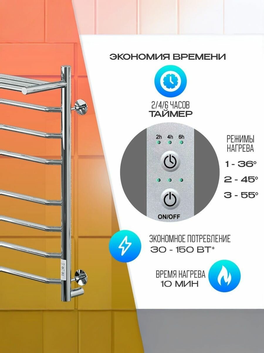 Полотенцесушитель электрический с полкой и терморегулятором Nika Way 3 с левым либо с правым подключением, скрытое либо прямое подключение. У полотенцесушителя есть таймер на отключение и терморегулятор и три режима работы. Экономичный полотенцесушитель с низким энергопотреблением и терморегулятором 800х500.