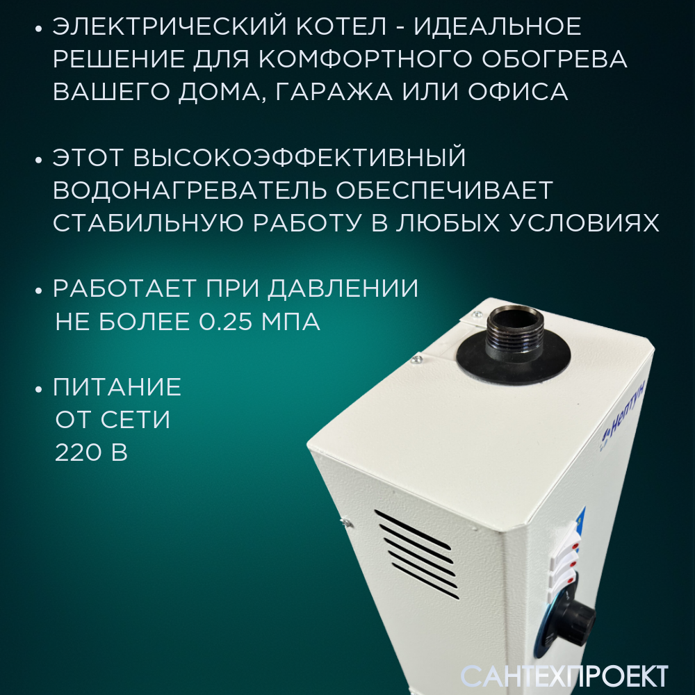 | Дополнительная информация | электроводонагреватель предназначен для водяного отопления зданий, имеющих открытую отопительную систему, работающую при давлении не более 0,25 МПА |