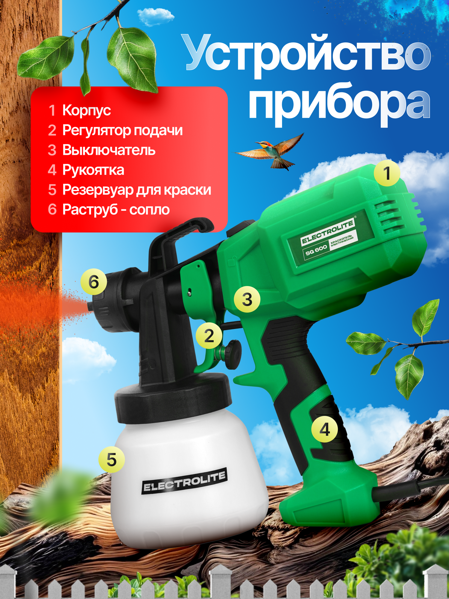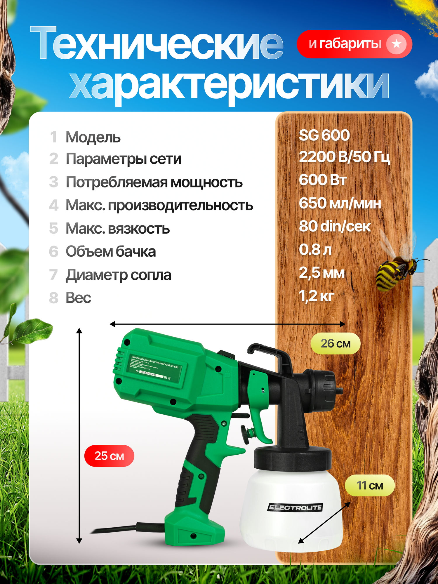 Электрический краскопульт разборной Electrolite SG 600 ( 600Вт, 650 мл/мин, 80 Din , 0,8л, 2,5 мм диаметр сопла ): сравнение цен, характеристики, фото, актуальное наличие и цены.