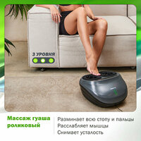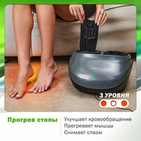 Интенсивное вибрирующее действие и комфортное сжатие с прогревом и обдувом помогают убрать боль и избавиться от напряжения в мышцах. Эффективно работающий массаж не только разминает стопу, но и деликатно пощипывает кожу, активизирует акупунктурные биологически-активные точки и рефлекторные зоны, и помогает вам снять усталость и улучшить кровообращение.