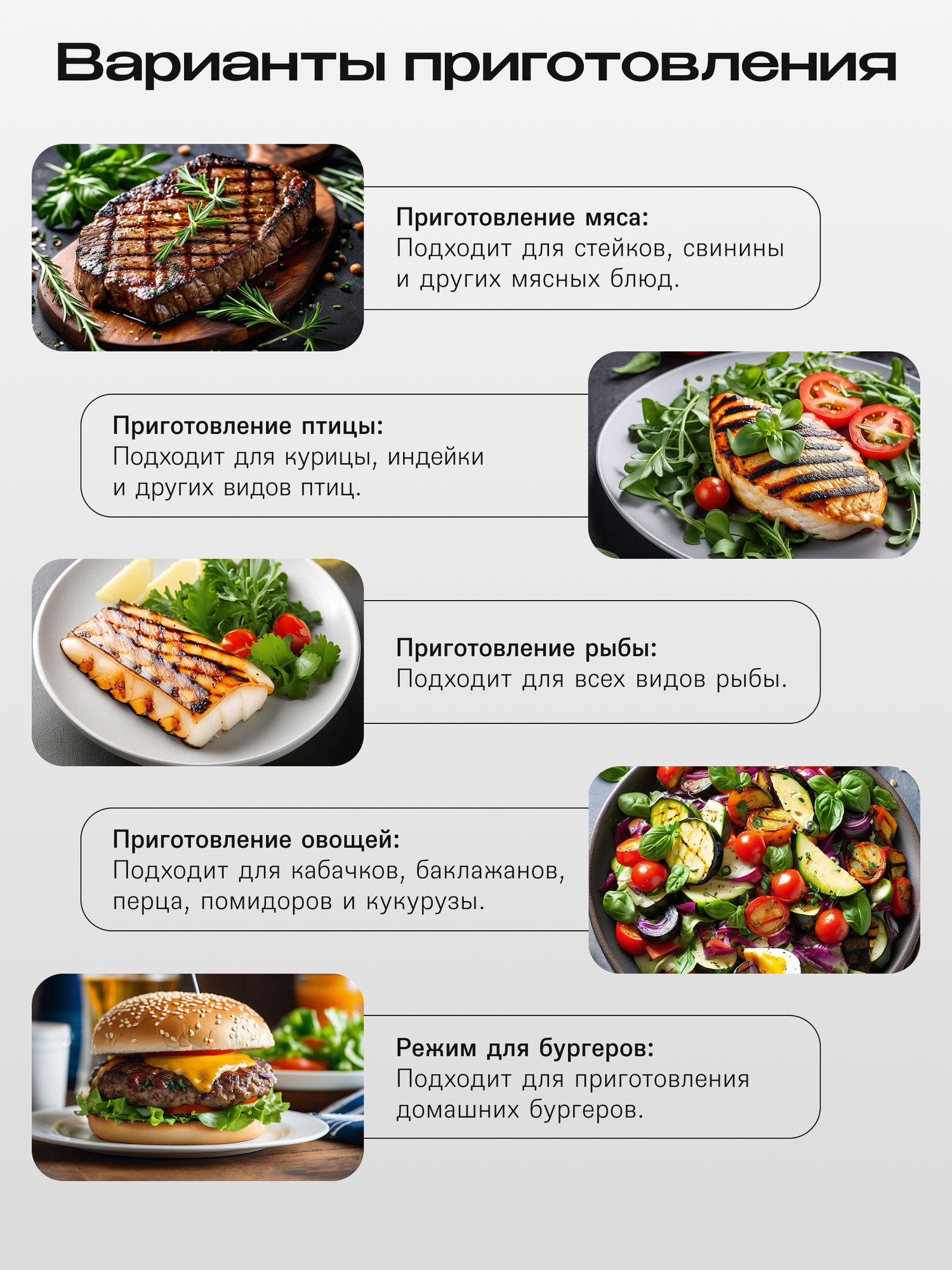 Электрогриль для дома — это прекрасный выбор для любителей вкусной и полезной пищи. Благодаря равномерному нагреву обеих пластин, продукты готовятся в 2 раза быстрее, а блюдо получается более сочным и полезным. Специальное антипригарное покрытие позволяет готовить без добавления масла.