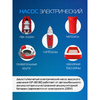 Marlin GP-80BD - двухступенчатый электрический насос высокого давления работает от автомобильного аккумулятора или встроенной аккумуляторной батареи (заряжается от электросети 220V). Регулятор давления – электронный с встроенным манометром (шаг 0,05 Bar, диапазон 0,1÷0,8 Bar), производительность – 500 л/мин, вес – 6 кг.